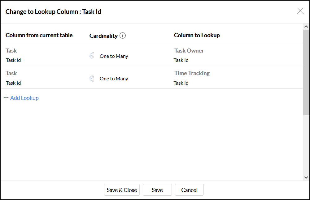 はい。このためには、新しいテーブルをTeamwork Projectsワークスペースにインポートまたは追加し、ワークスペースの追加したデータと既存のデータの間のルックアップ関係性を定義します。2つのテーブルの間のルックアップ関係性を定義するには、テーブルに共通の列が少なくとも1つあることが必須条件です。下の手順にしたがって、ルックアップ関係性を作成します。