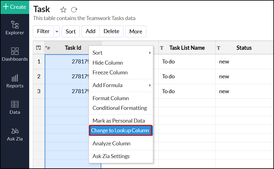 対応するテーブルを開き、列ヘッダーを右クリックして、 [ルックアップ列への変更]オプションを選択します。