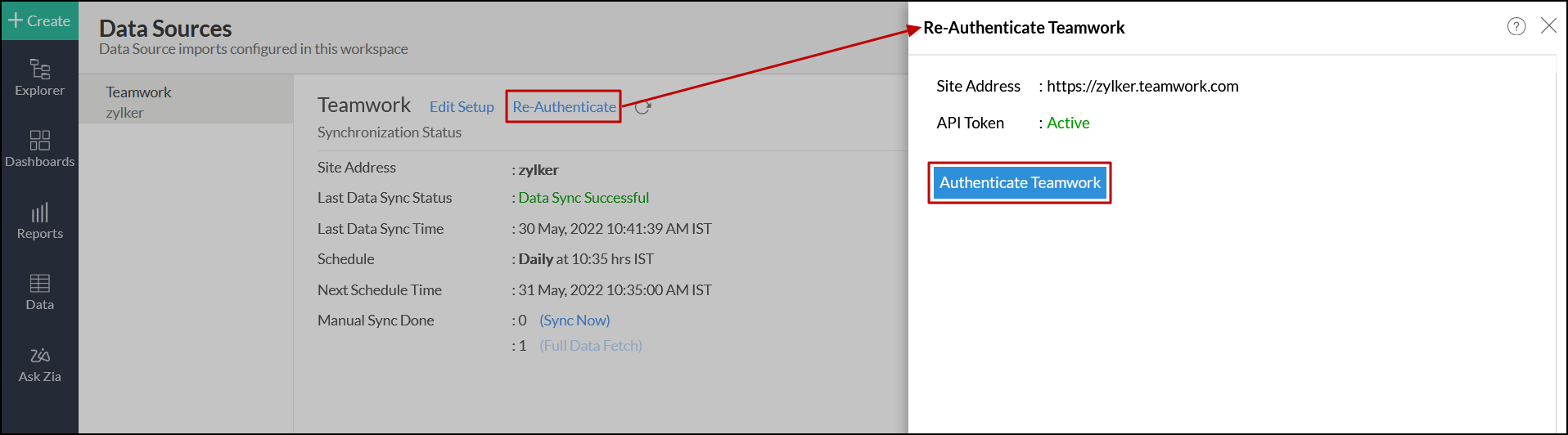 Teamwork Projectsデータソースに移動し、[再認証]リンクをクリックします。