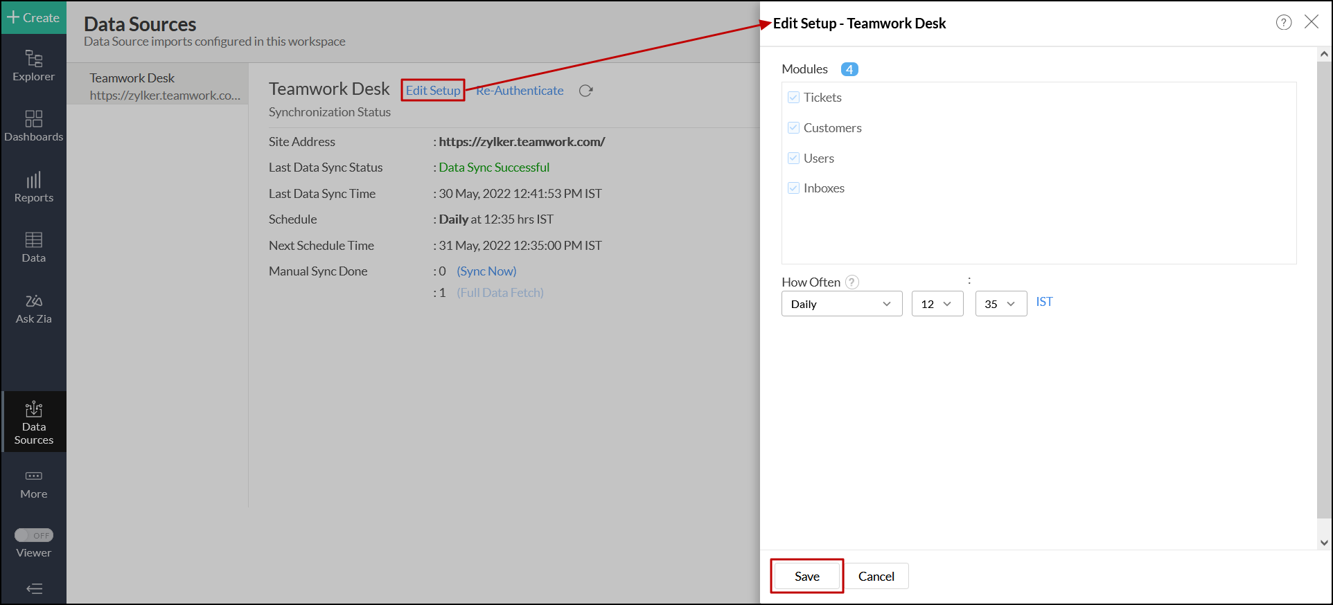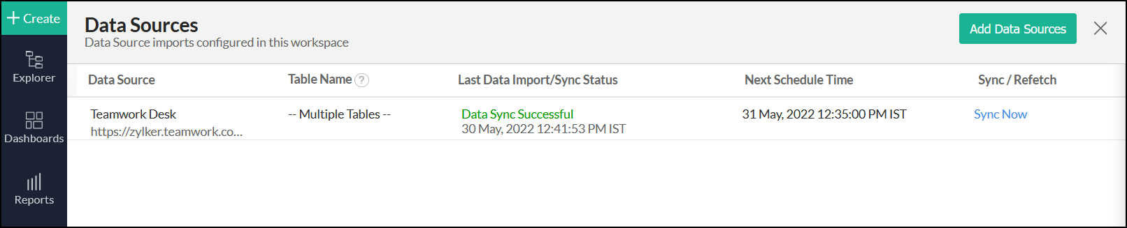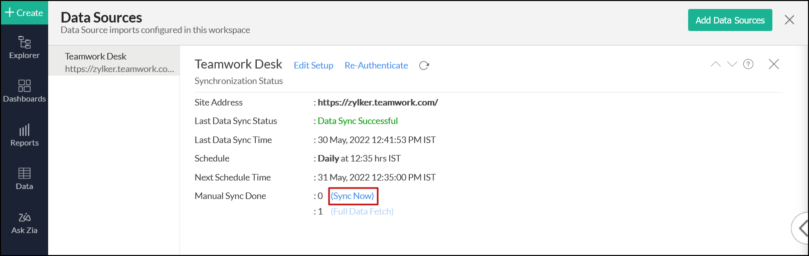 Teamwork Deskデータソースページにアクセスして、[今すぐ同期]をクリックすることもできます。