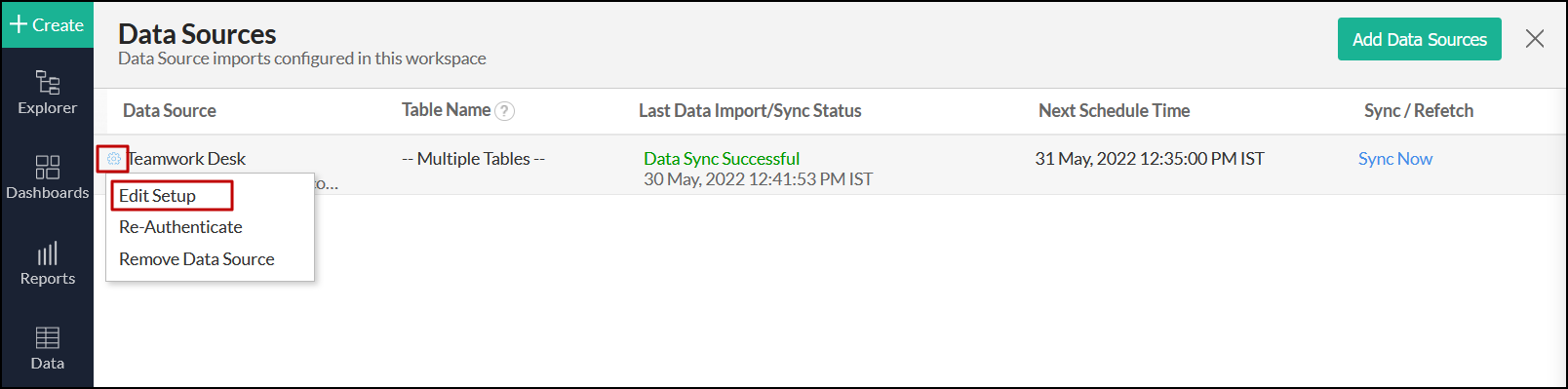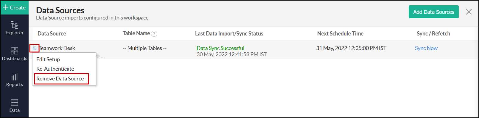 はい。これを行うには、サイドパネルから [データソース] オプションをクリックしてこのページにアクセスします。表示されるページで、Teamwork Deskソースに移動し、対応する[今すぐ同期]ボタンをクリックします。