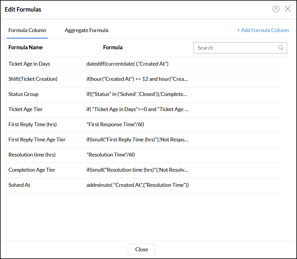 Analytics Plusの強力な数式エンジンを使ってレポートの数式を定義し、要件に合わせたレポートを作成することができます。詳細は、「数式を追加」を参照してください。Teamwork Deskモジュールに基づいて作成されたデフォルトの数式もいくつかあります。デフォルトの数式を表示するには、対象のテーブルを開き、[追加]をクリックして、[数式を編集]オプションを選択します。