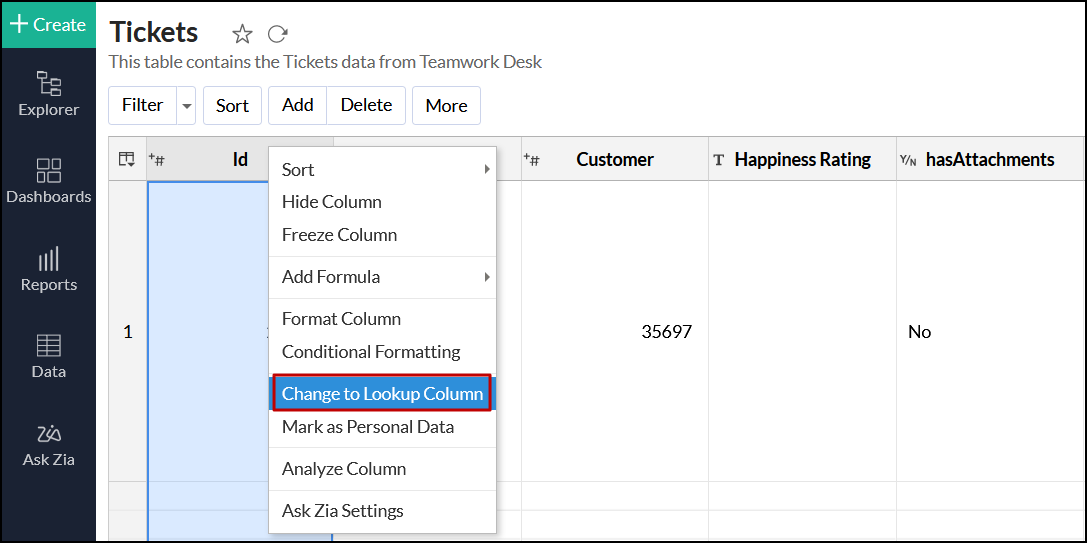 対応するテーブルを開き、列ヘッダーを右クリックして、[ルックアップ列に変更]オプションを選択します。