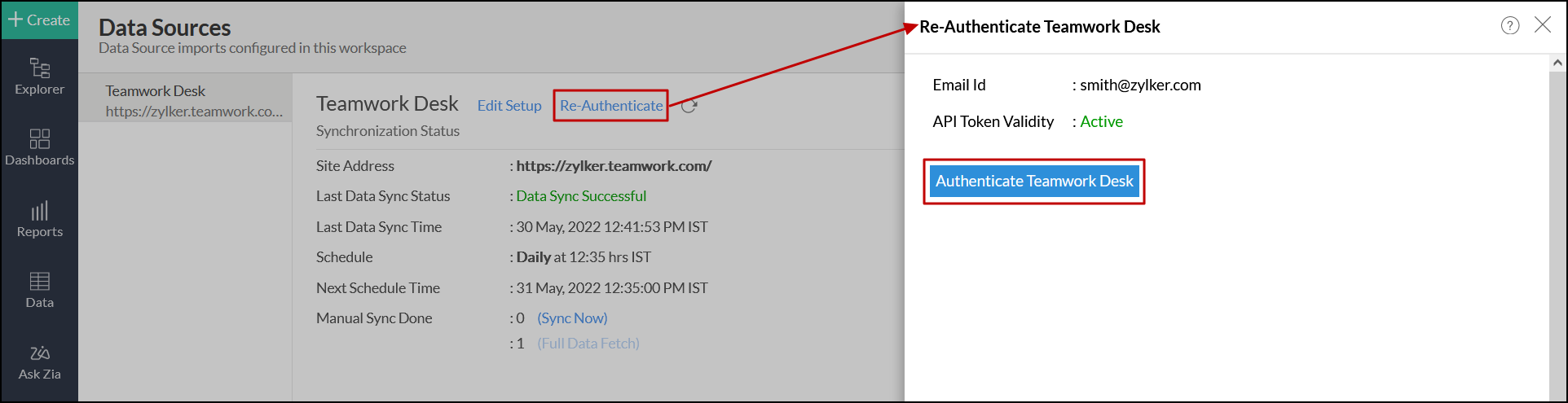 Teamwork Deskデータソースに移動し、[再認証]リンクをクリックします。
