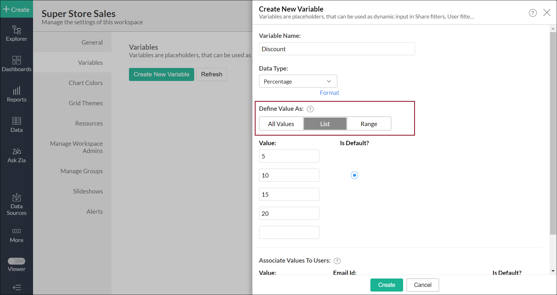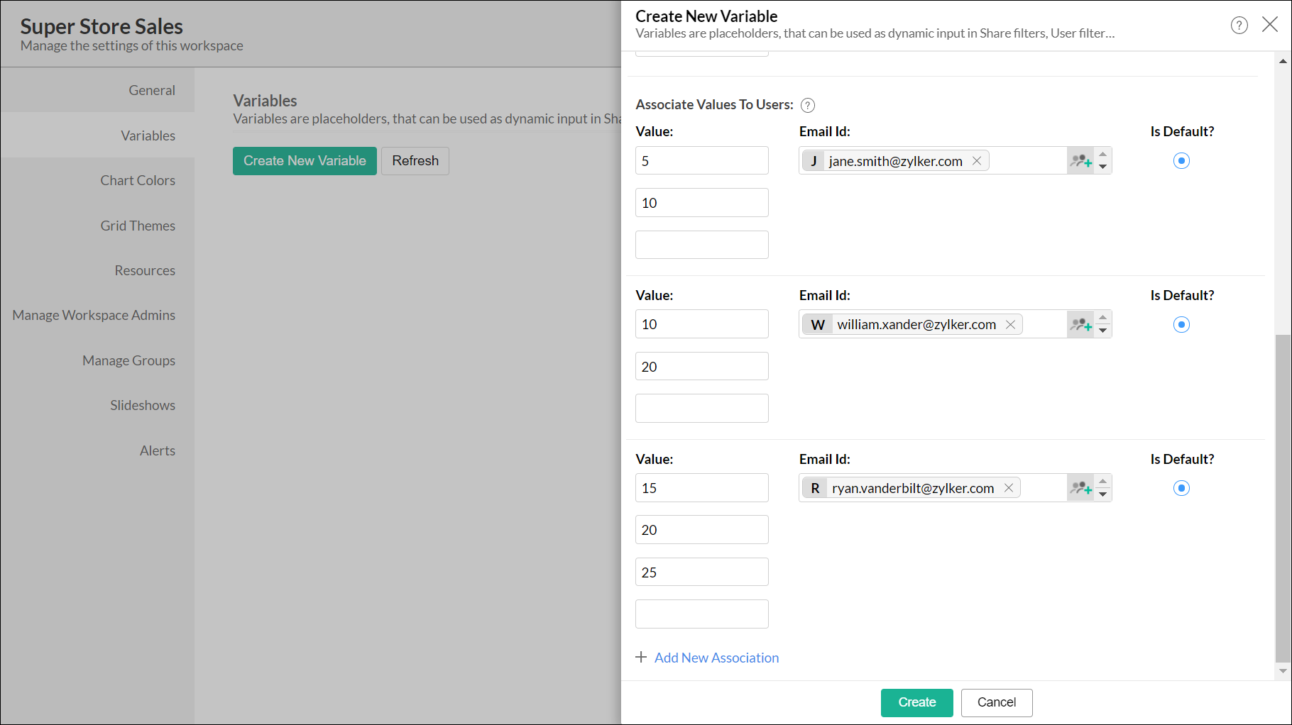 注記:変数を作成する際、変数内の値を特定のユーザーまたはグループに関連付けることができます。複数の値が関連付けられている場合、共有ユーザーはWhat-If分析を使用して、関連付けられている値に対応するレポートの変化を確認できます。