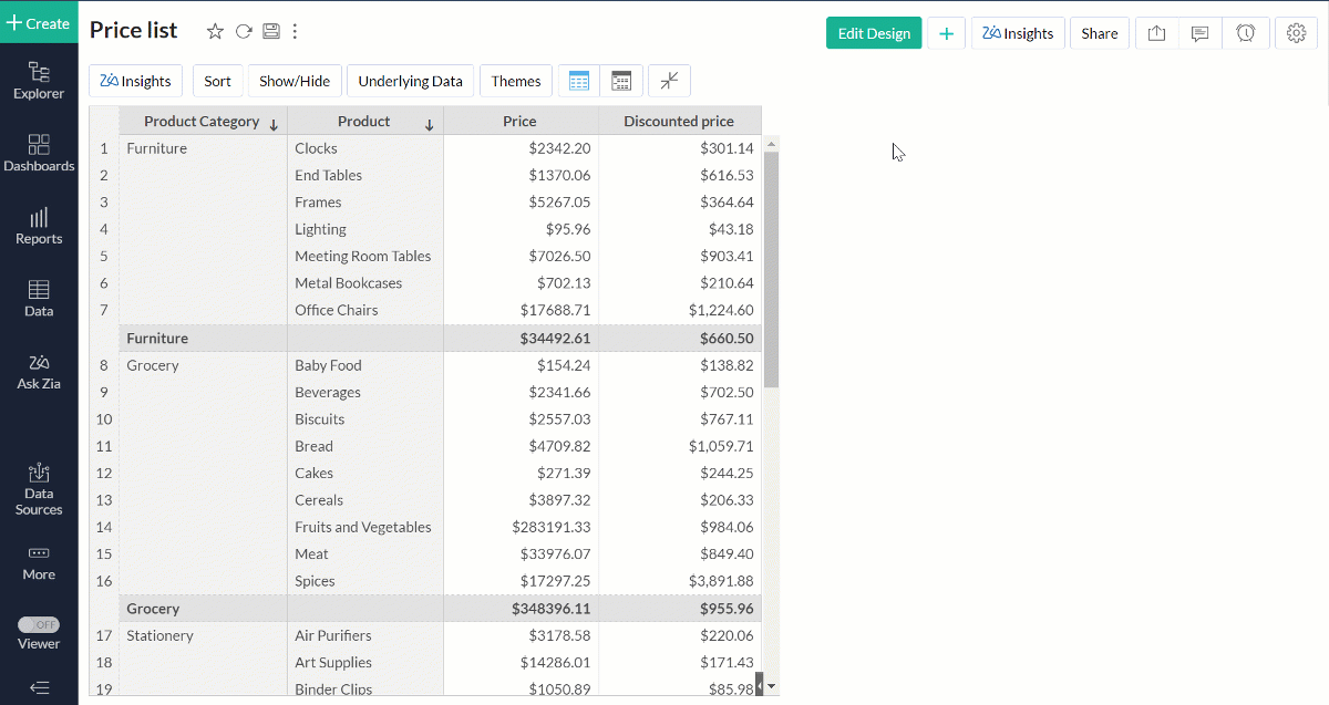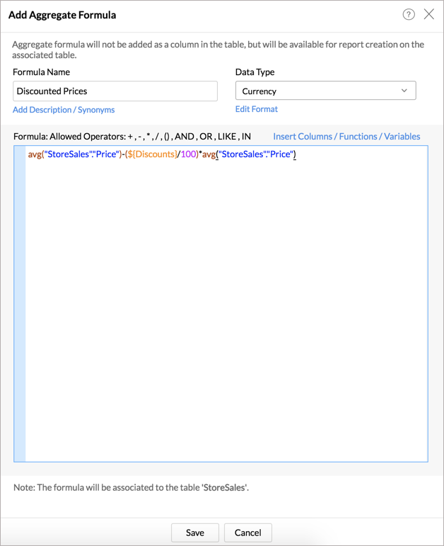 例として、割引価格の集計数式カラムを含むピボットレポートを作成する場合、割引価格カラムの値は、変数に定義されたデフォルト値(10%)に基づいて計算されます。