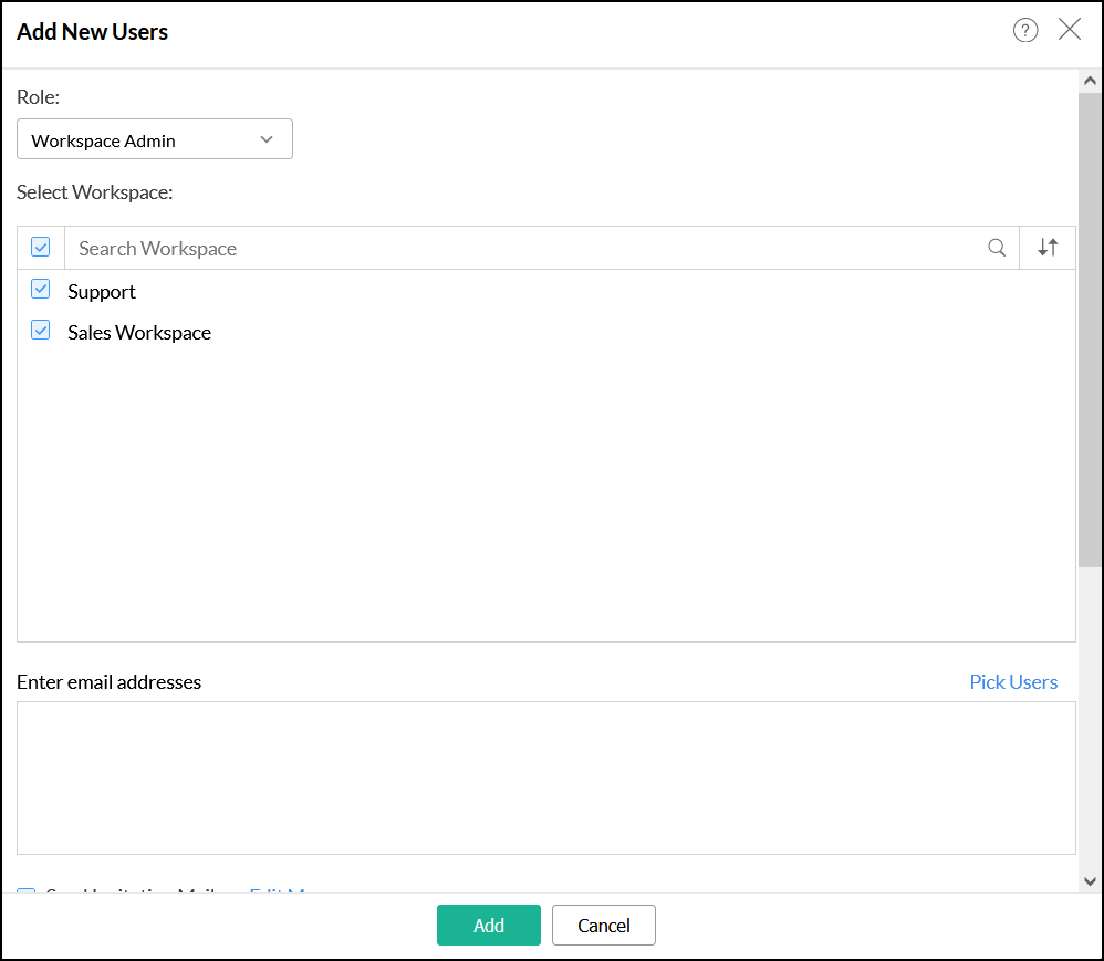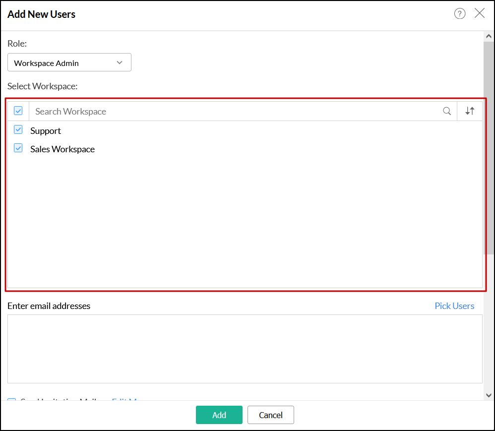 はい。Analytics Plusでは、複数のワークスペースの管理者としてユーザーを追加できます。この場合、[新しいユーザーから追加]ダイアログから対象のワークスペースを選択します。