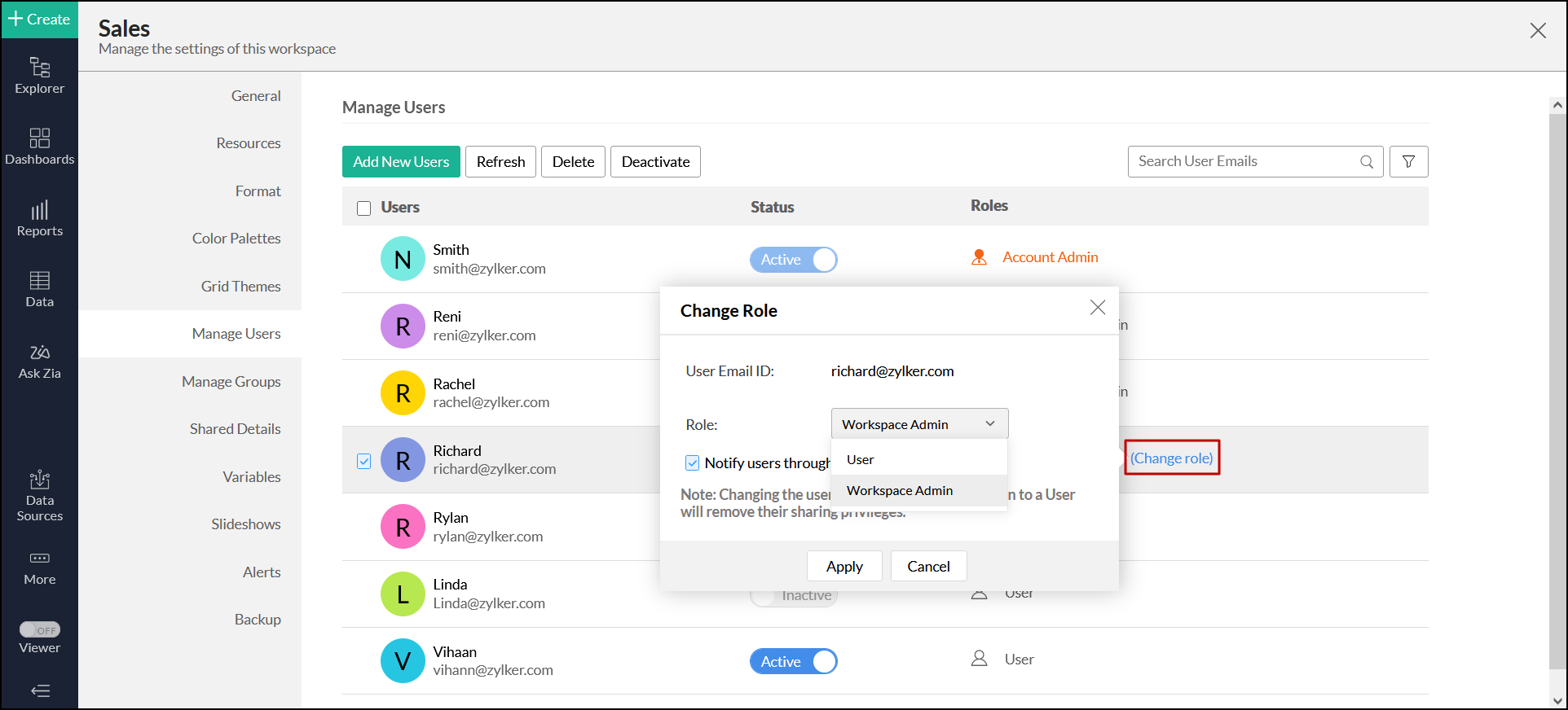 ユーザーからワークスペース管理者権限を削除するには、対象のワークスペース管理者名に対応する[ロールを変更]リンクをクリックします。表示されるダイアログで、ロールドロップダウンから対象のユーザーロールを選択して、[適用]をクリックします。