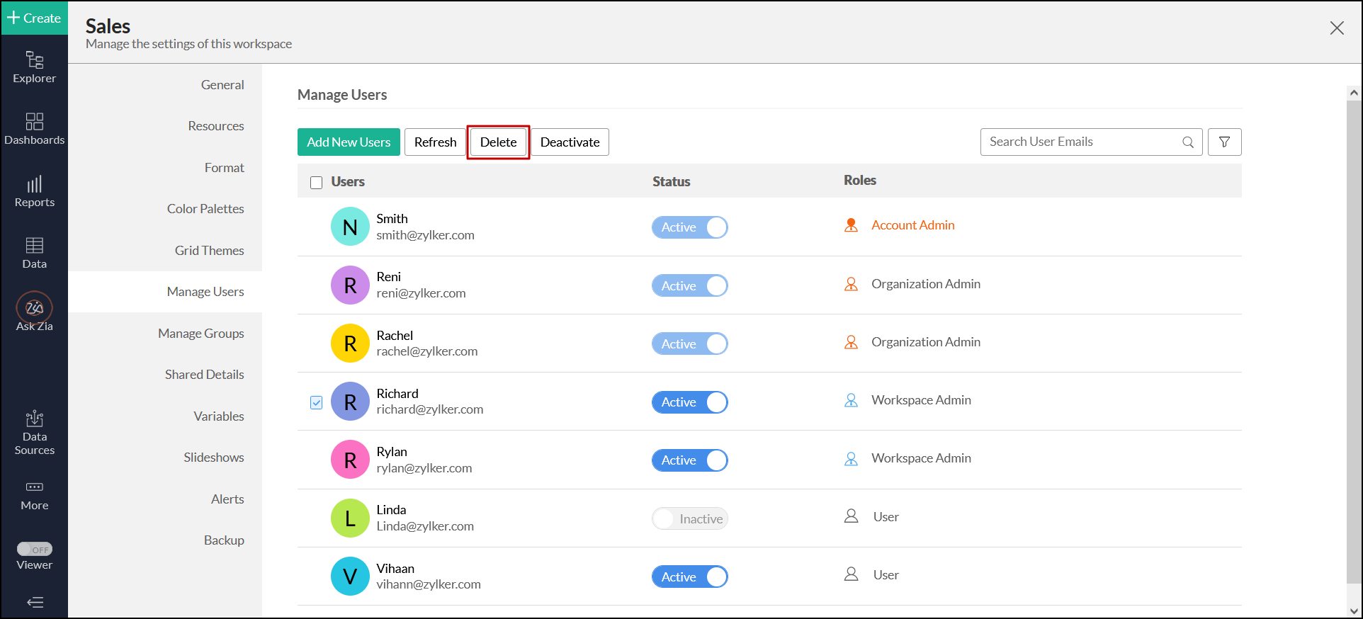 ワークスペース管理者は、Analytics Plus組織の個別ワークスペースの管理者です。ワークスペース管理者は、ワークスペースの削除、名前変更およびバックアップ以外はすべての操作を実行できます。