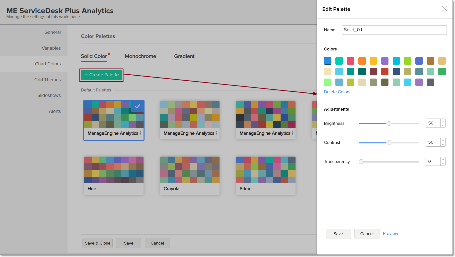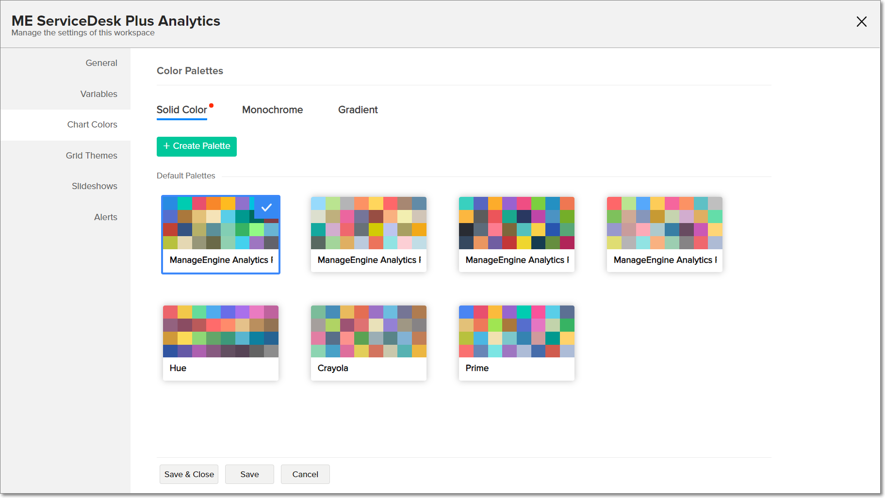 デフォルトでは、Analytics Plusには、3タイプのカラーパレットがあります。チャートカラーを毎回手動で割り当てるのではなく、チャートに適用する色のセットを定義して、各自のパレットを作成することもできます。