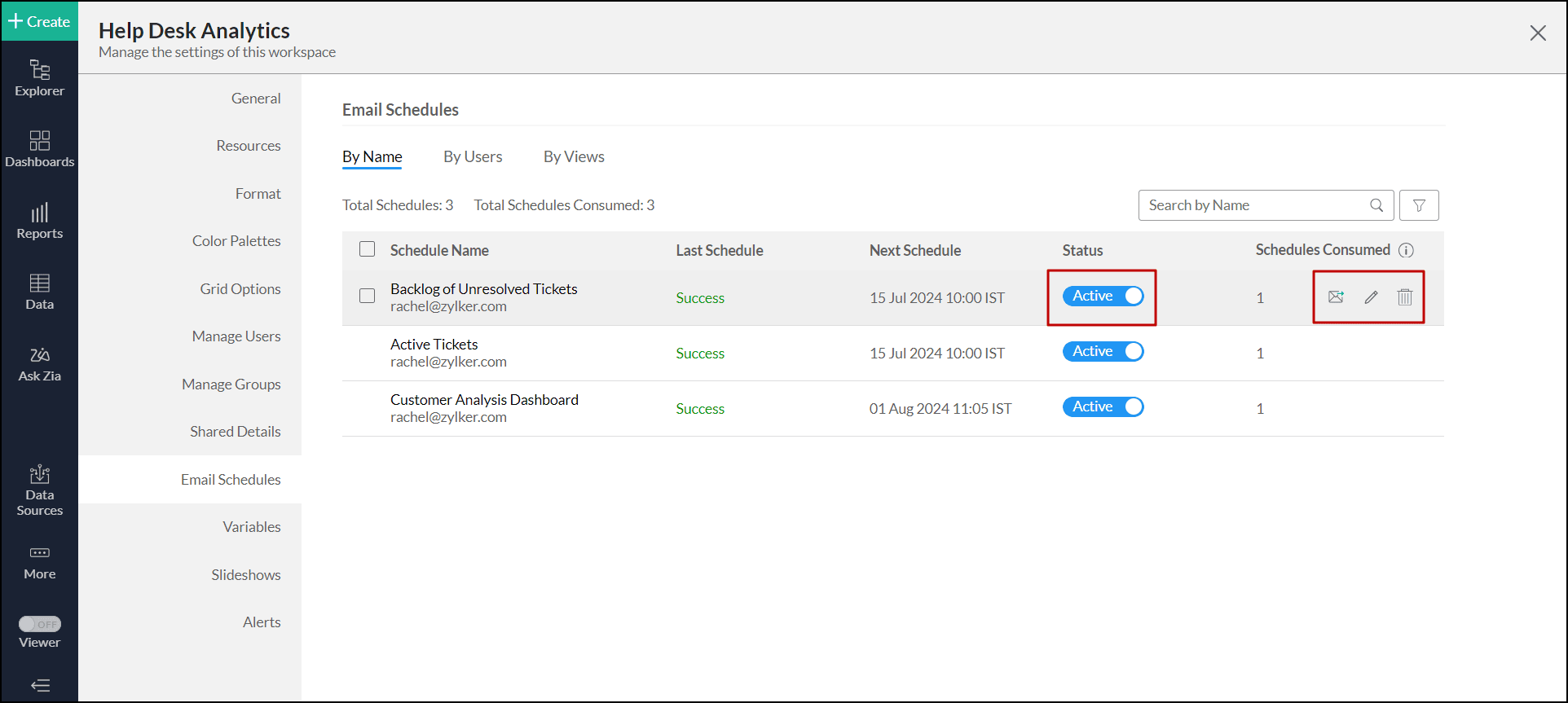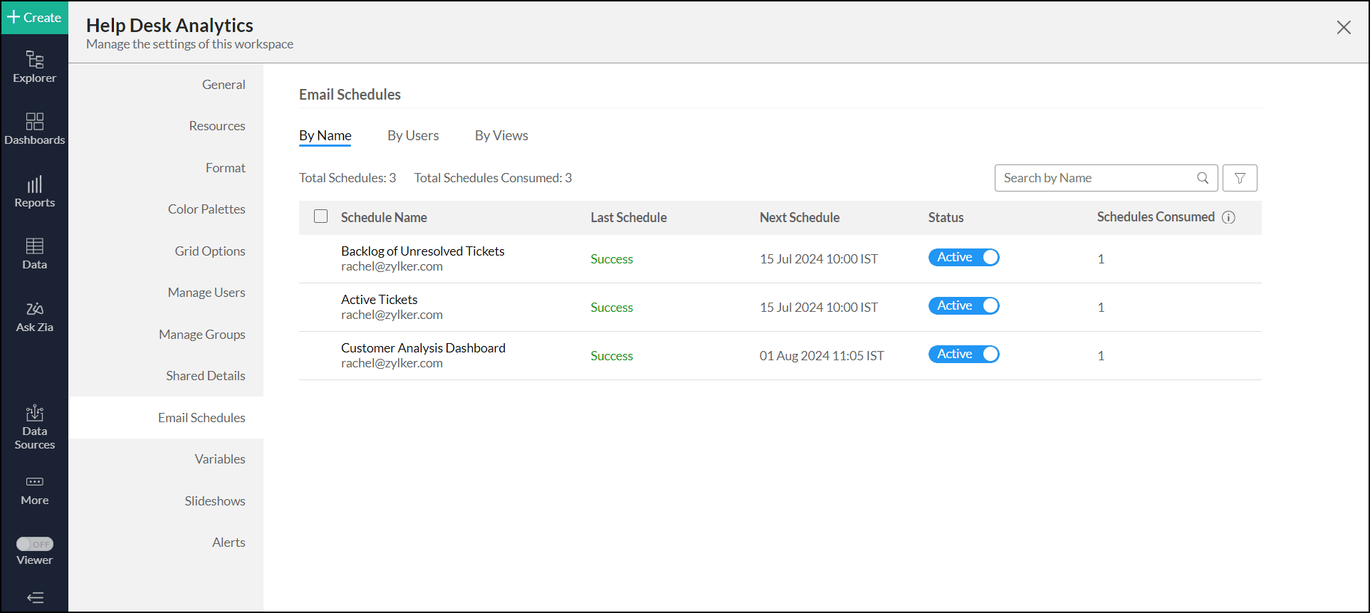 Analytics Plusでは、ワークスペース内のすべてのメールスケジュールを効率的に管理できます。このためには、サイドペインの[ワークスペース設定]をクリックし、[メールスケジュール] タブに移動します。メールスケジュールは、3つのグループに明確に分かれ、以下のように、管理プロセスを整理します。