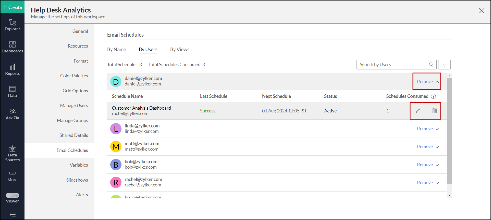 - 削除:このオプションでは、選択したメールスケジュールからユーザーを削除できます。