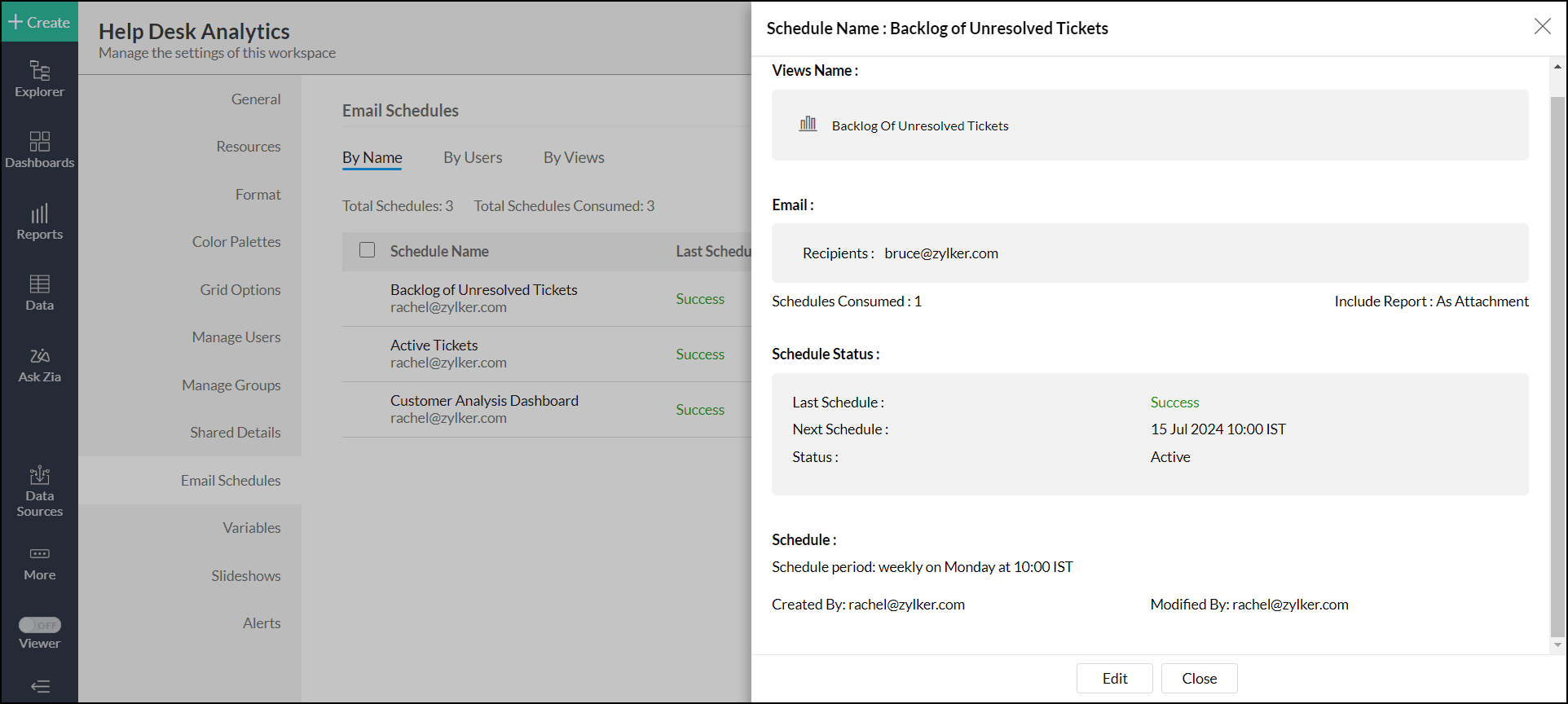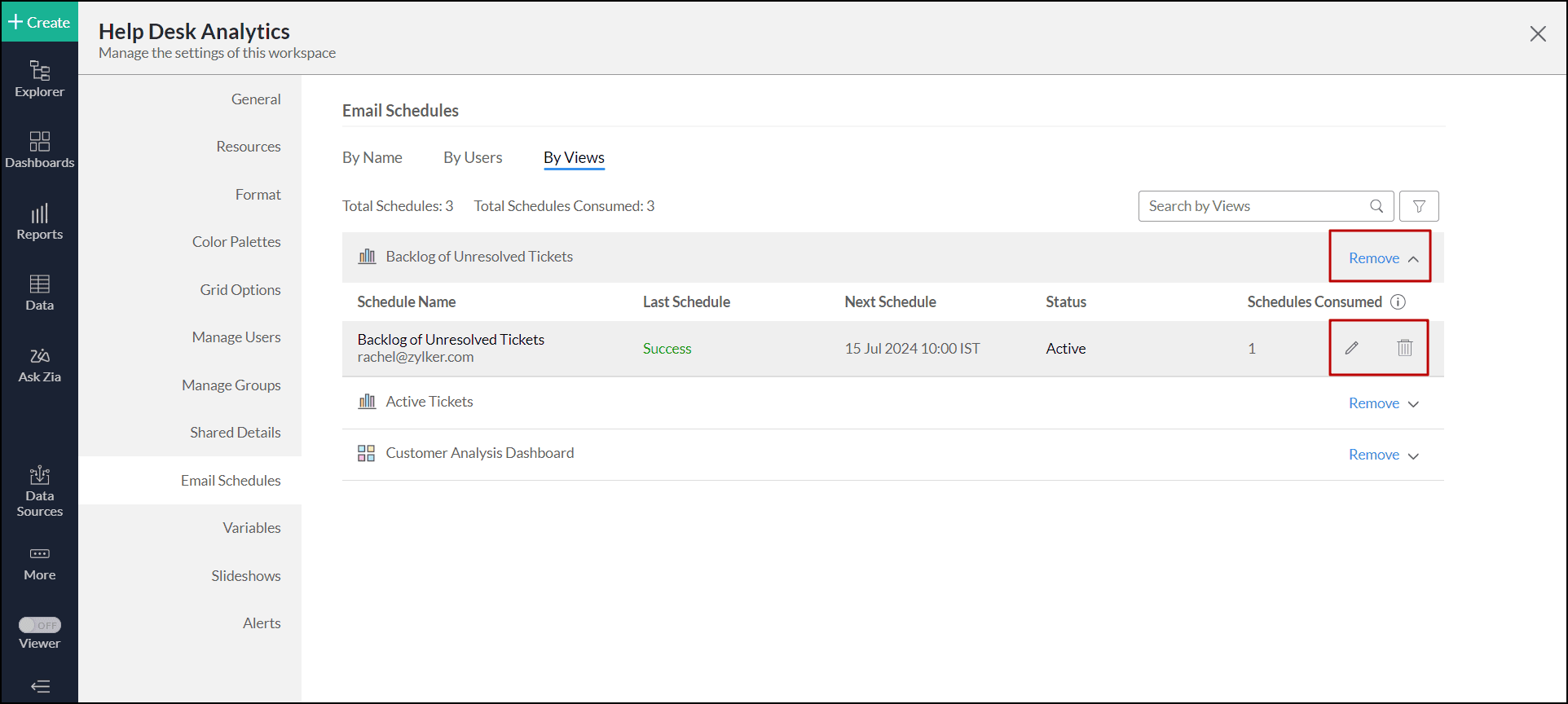 - 削除:このオプションでは、選択したメールスケジュールからレポートを削除できます。