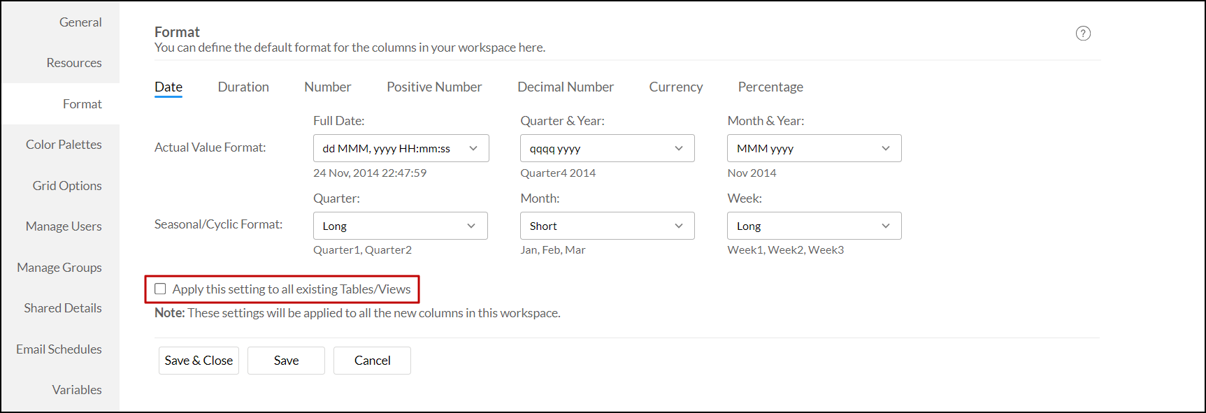 必要な形式オプションを構成したら、「この設定をすべての既存のテーブル/レポートに適用」 チェックボックスを選択して、これらの設定をワークスペースの既存のテーブルおよびレポートに適用します。この操作は元に戻すことができませんので、注意してください。