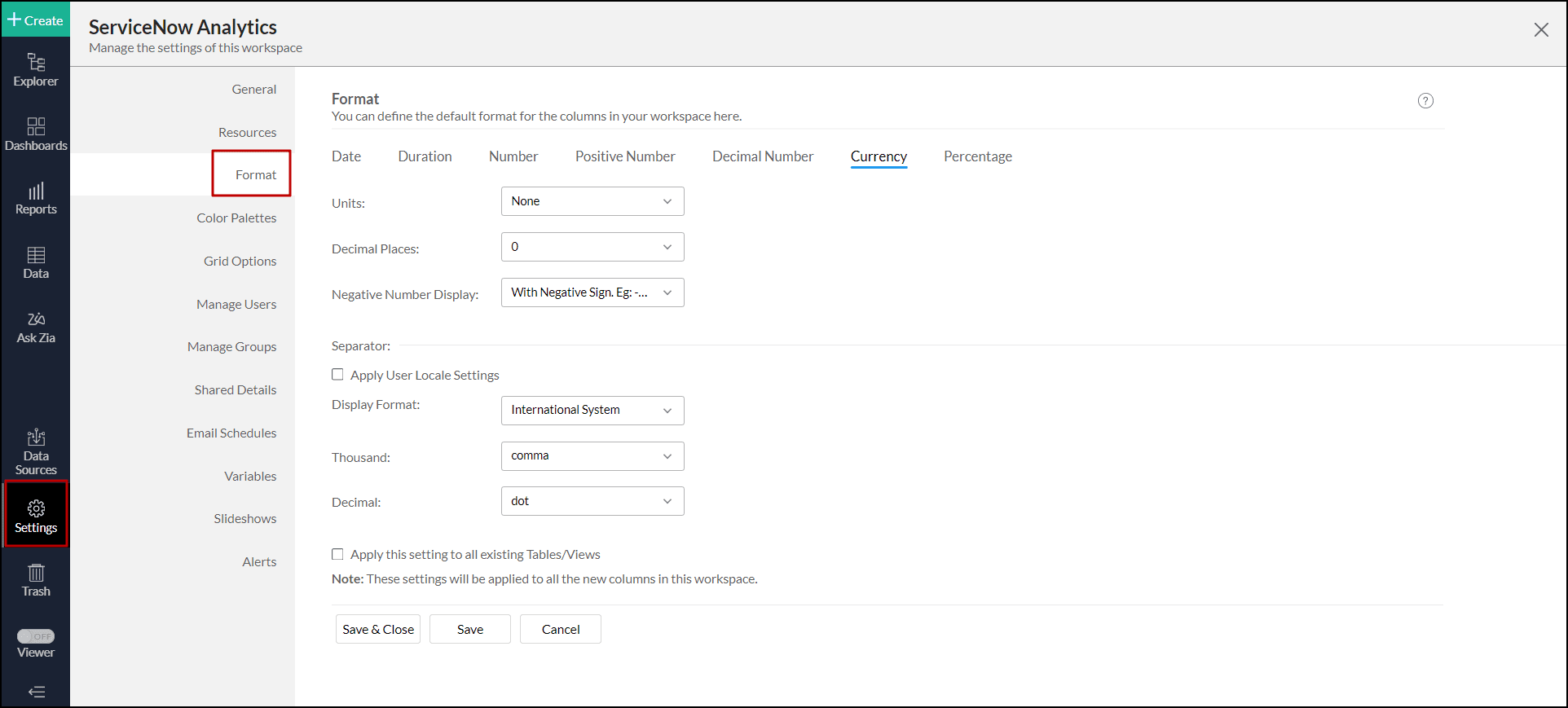 Analytics Plusでは、ワークスペースのすべてのレポートにワークスペースレベルの形式設定オプションを指定できます。日付、時間長、数値、正数、小数、通貨、およびパーセンテージの個別の形式を構成できます。