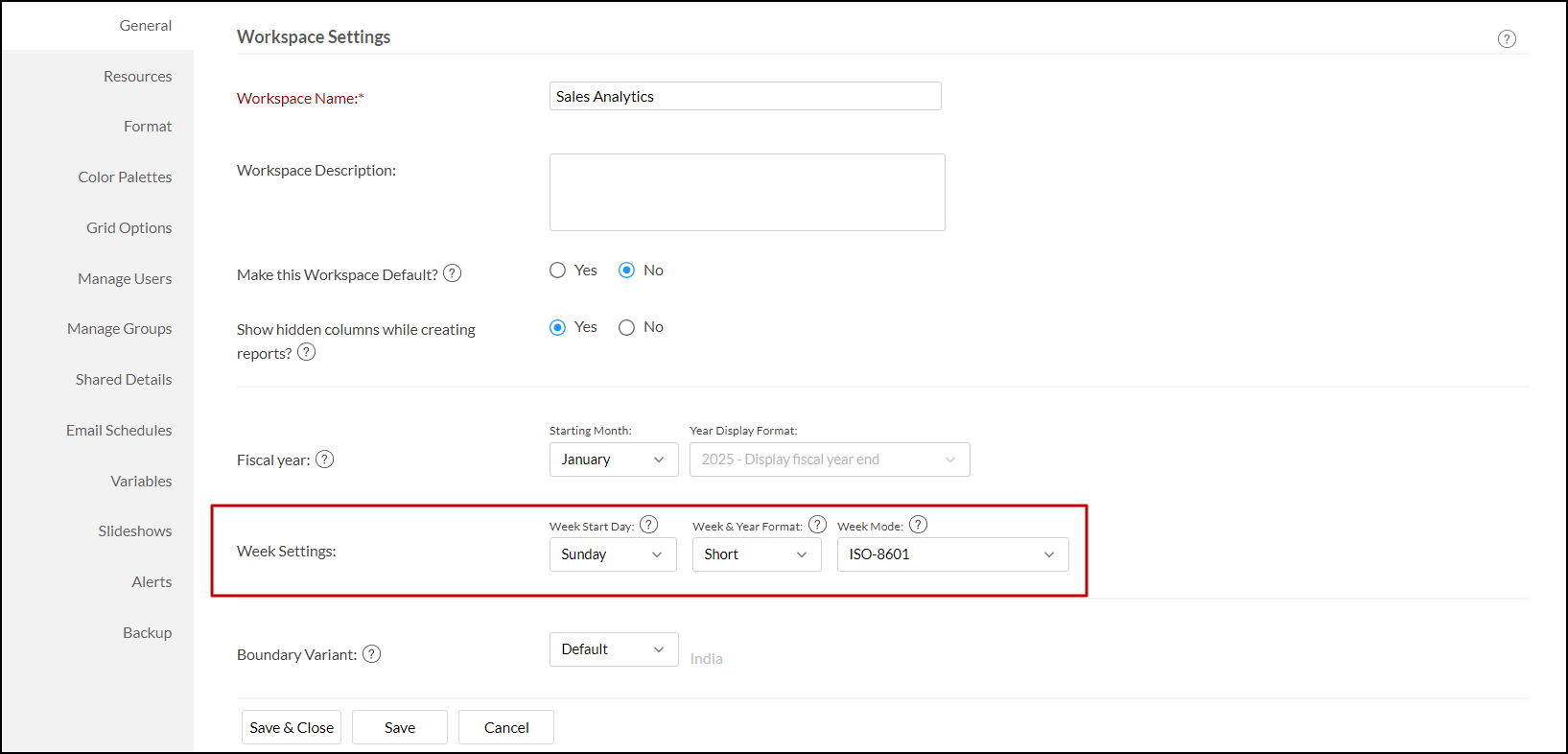 - 週と年の形式:ワークスペースで週を表示する形式を選択できます。以下のオプションが利用できます。