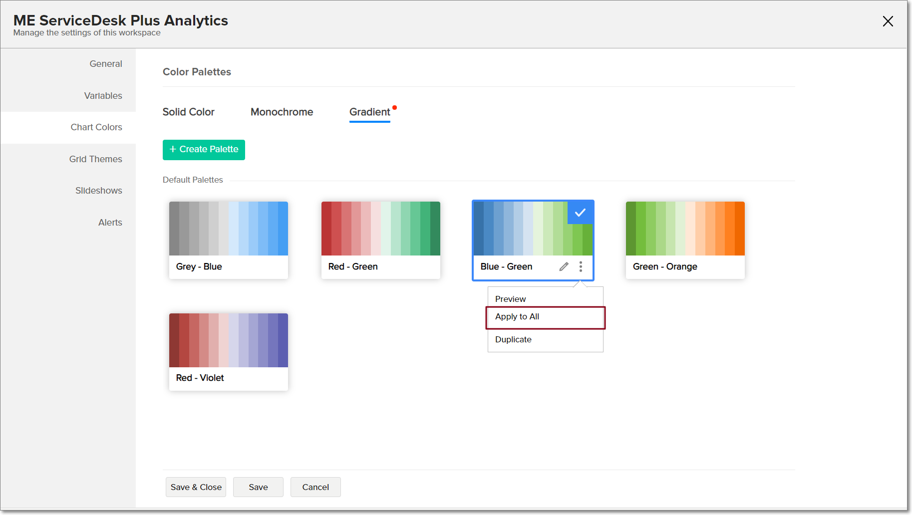 使用中のワークスペースですべての既存のチャートにカスタマイズしたパレットを適用するには、対象のパレットに移動し、マウスオーバーして表示される「他の操作」アイコンをクリックします。[すべてに適用]オプションを選択して、[保存]をクリックします。これで、パレットからワークスペースのすべての既存のチャートに色が適用されます。これは元に戻すことはできません。