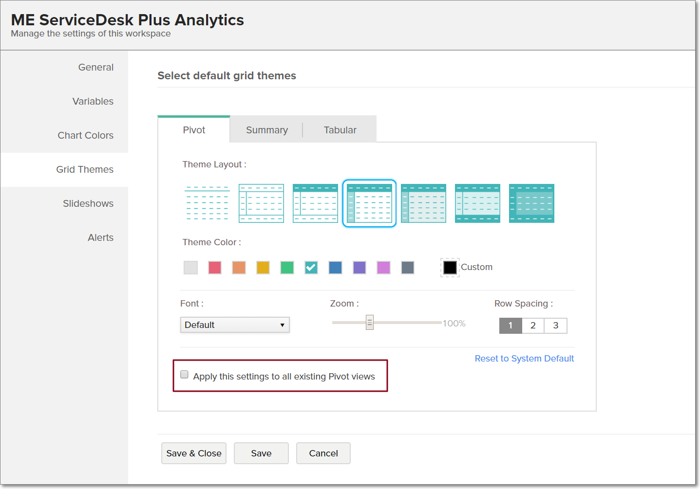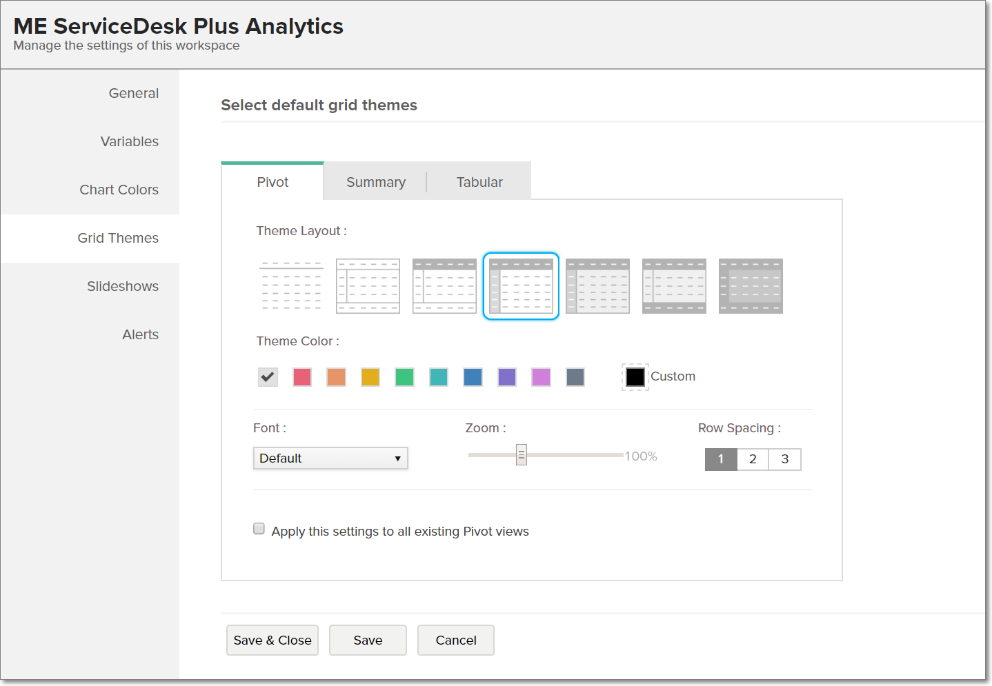 修正したグリッドテーマをワークスペースの既存のピボット、サマリーまたは表形式レポートに適用するには、ワークスペース設定ページのグリッドテーマの「この設定をすべての既存の既存のレポートに適用」チェックボックスを選択します。