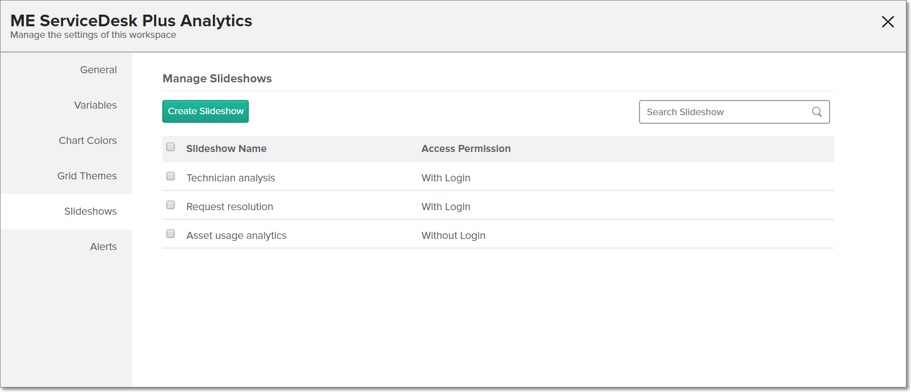 Analytics Plusでは、スライドショーページからお使いのワークスペースの利用中のスライドショーを管理できます。このページにアクセスするには、サイドパネルの[設定]ボタンをクリックし、「スライドショー」 セクションに移動します。