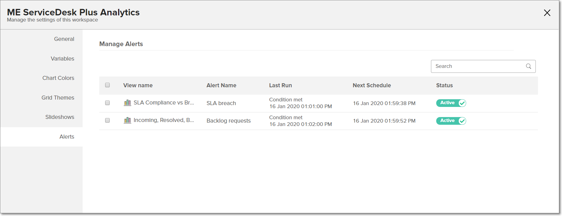 ワークスペース設定ページのアラートセクションには、ワークスペースで作成したデータアラートがすべて表示され、その各種操作を実行できます。