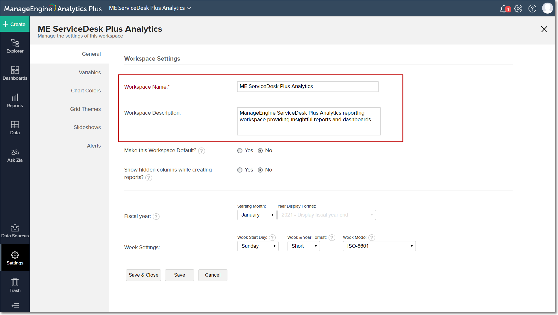 Analytics Plusでワークスペースの名前を変更するには、サイドパネルから[設定]オプションを選択し、 [全般]タブに移動して、[ワークスペース名] と「ワークスペースの説明」フィールドを必要に応じて修正します。