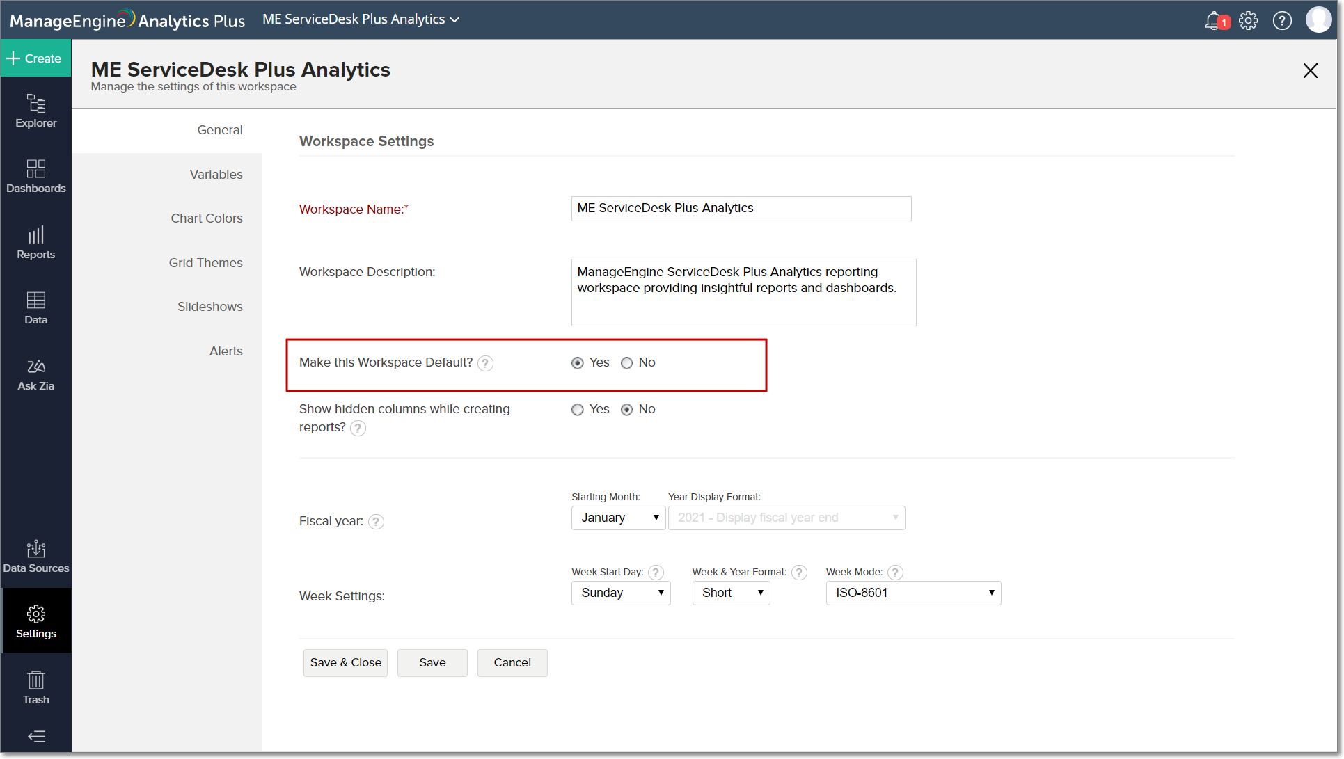 デフォルトのワークスペースを設定すると、ログインするたびにそのワークスペースを自動で開くことができるようになります。デフォルトのワークスペースを設定するには、左パネルの[設定]ボタンをクリックし、[全般]タブに移動します。「このワークスペースをデフォルトにしますか?」オプションで[はい]ラジオボタンを選択し、[保存]をクリックします。Analytics Plusホームページからワークスペースをデフォルトに設定することもできます。詳細は、「Viewing Workspaces - 10.Is it possible to set a workspace as default?」を参照してください。