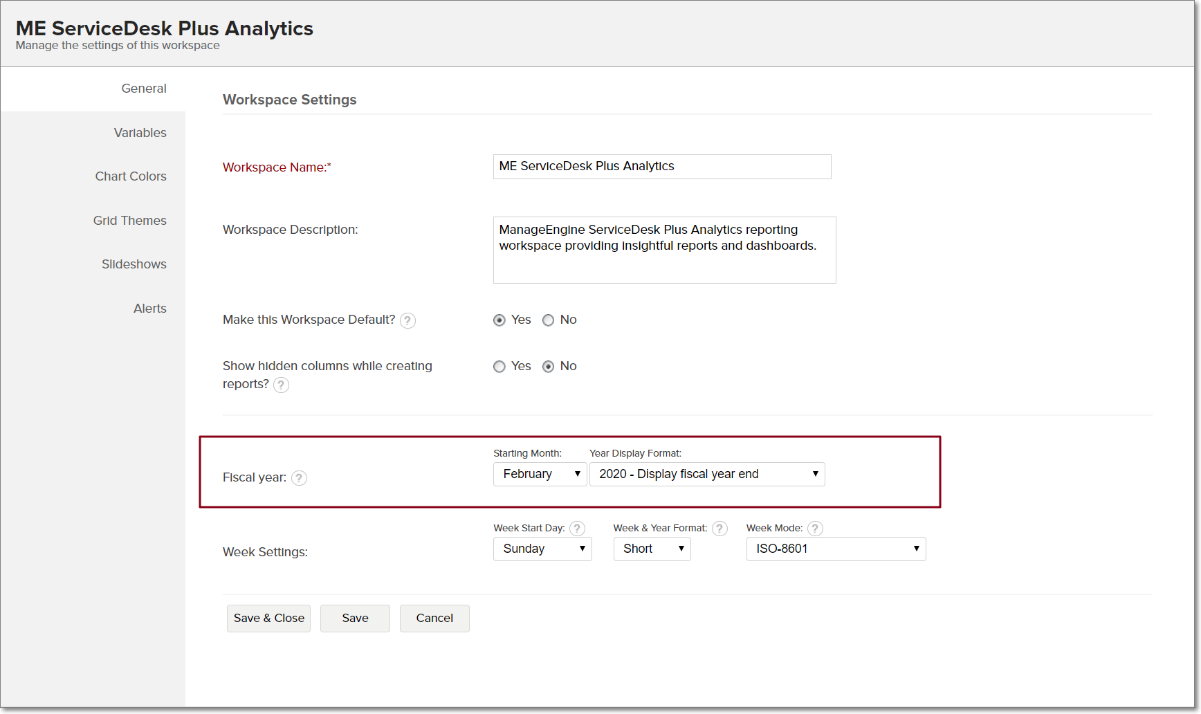 メモ:ワークスペース設定ページで形式変更を行うと、そのワークスペースのすべてのレポートに適用されます。週と年形式はレポートレベルで変更することもできます。詳細は、「Customizing a Chart - Format Setting」を参照してください。