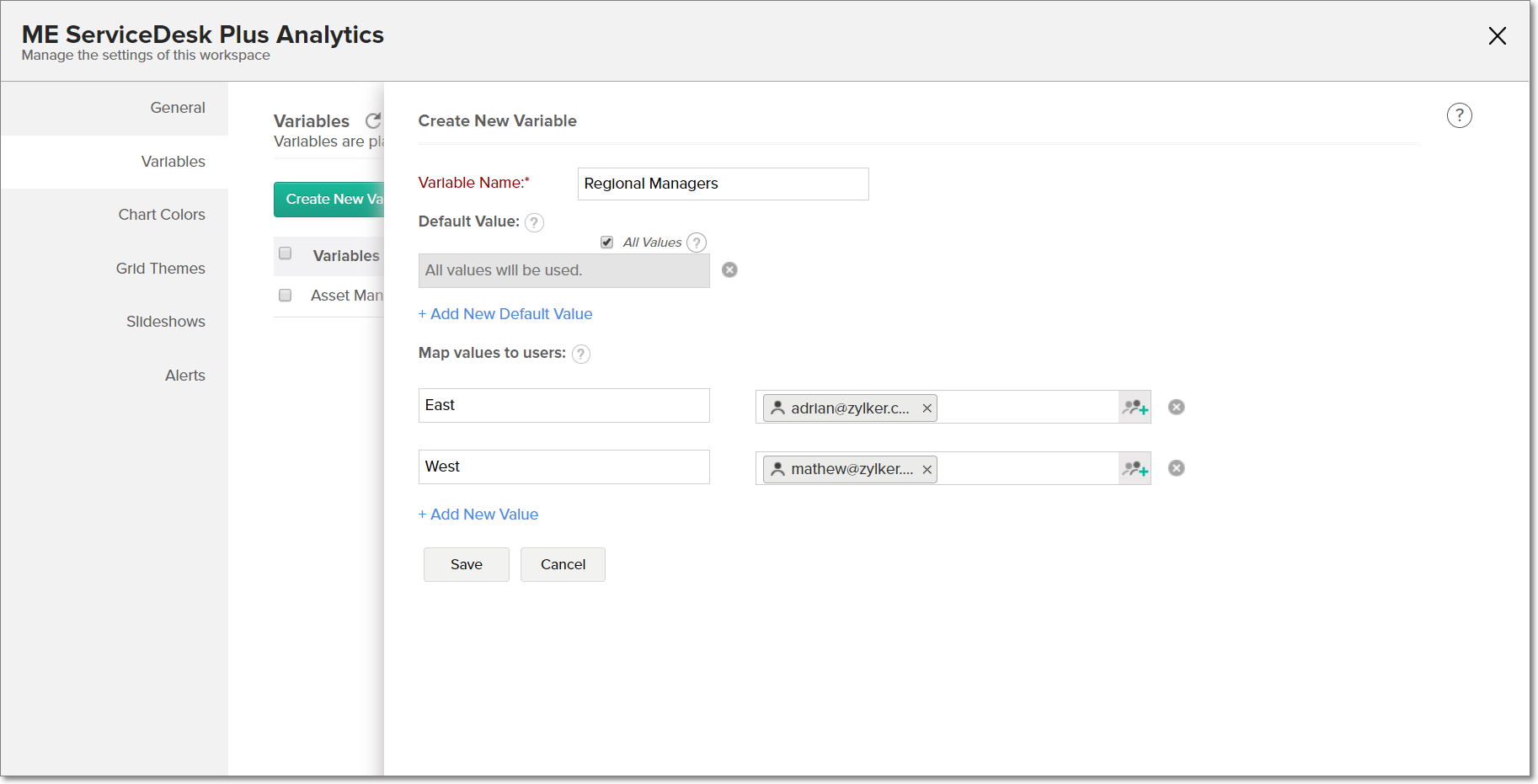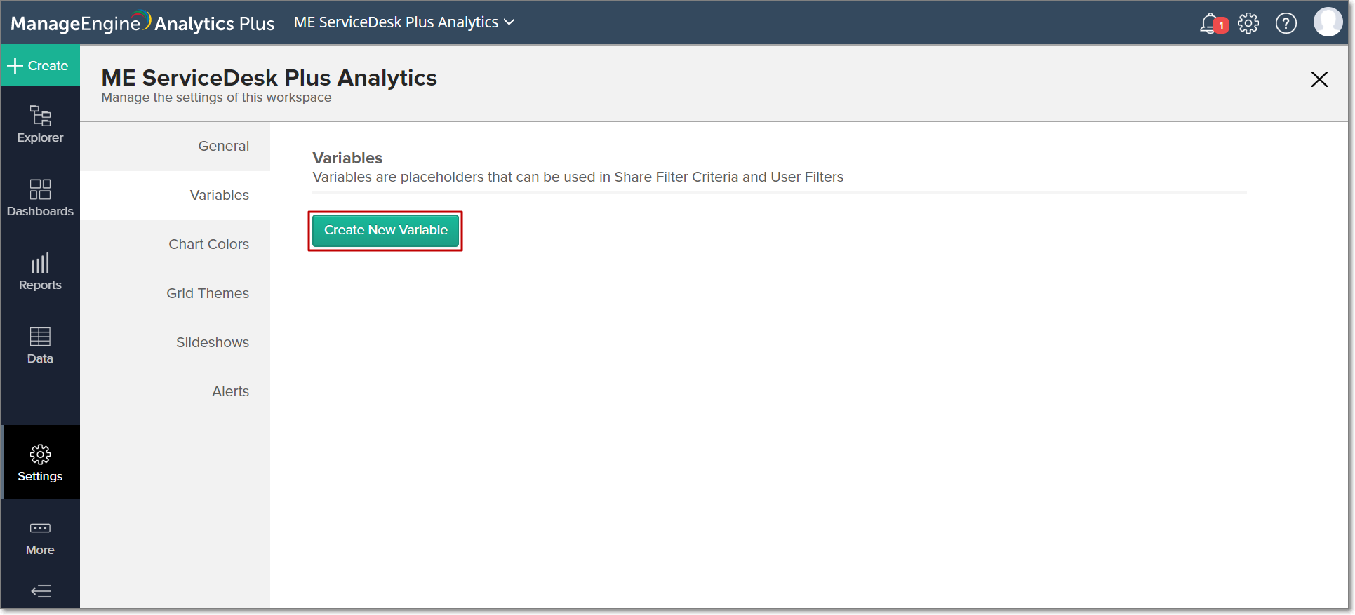 変数は、管理者がワークスペースの個別ユーザーに動的値を割り当てることができるプレースホルダーです。レポートとダッシュボードの共有中にフィルター基準セクションの変数を使用することができます。レポートの共有中に変数を使用する詳細は、「Sharing views to a user - 12. What are the default variables in Analytics Plus?」を参照してください。