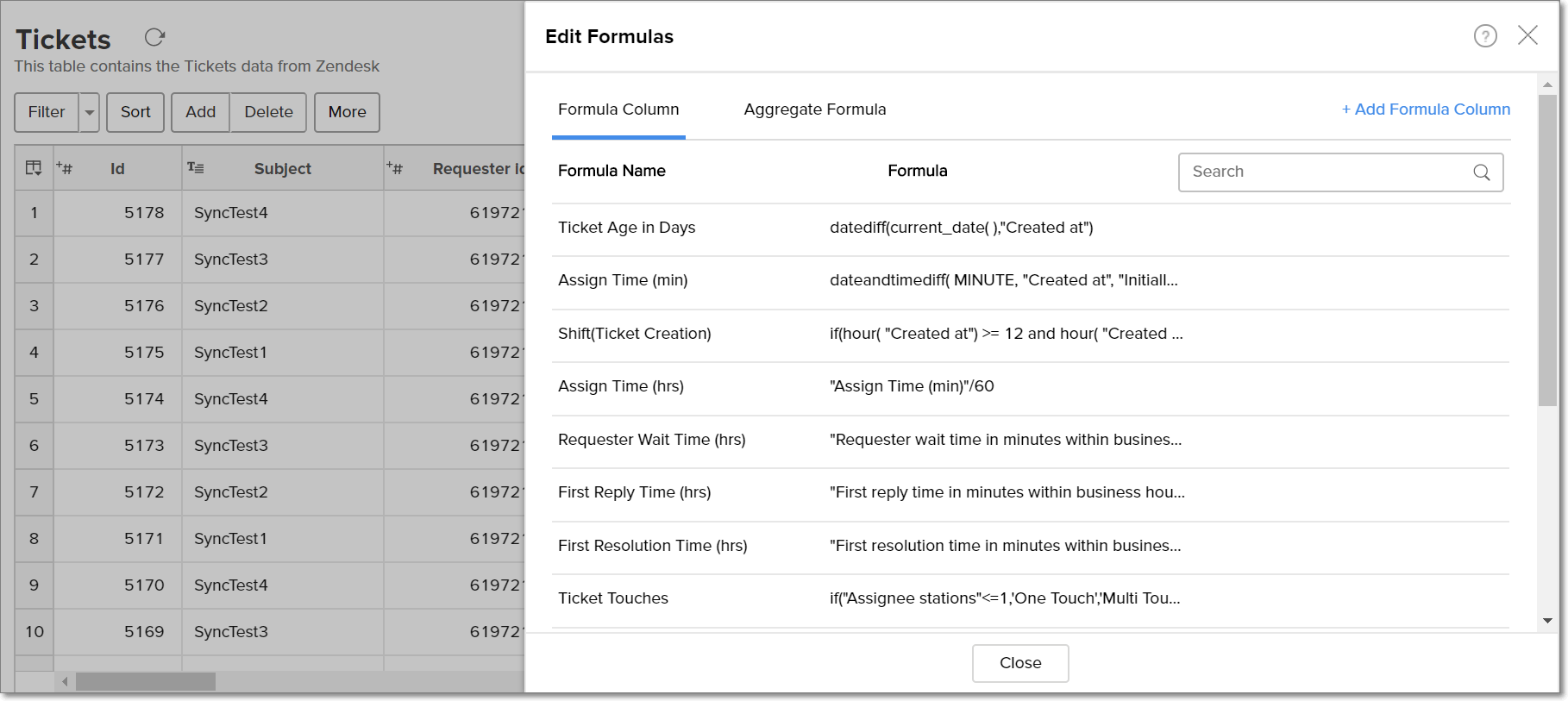 Analytics Plusの強力な数式エンジンを使ってレポートの数式を定義し、要件に合わせたレポートを作成することができます。詳細は、「数式を追加」を参照してください。Zendeskモジュールに基づいて作成されたデフォルトの数式もいくつかあります。デフォルトの数式を表示するには、対象のテーブルを開き、 [追加]をクリックして、[数式を編集]オプションを選択します。