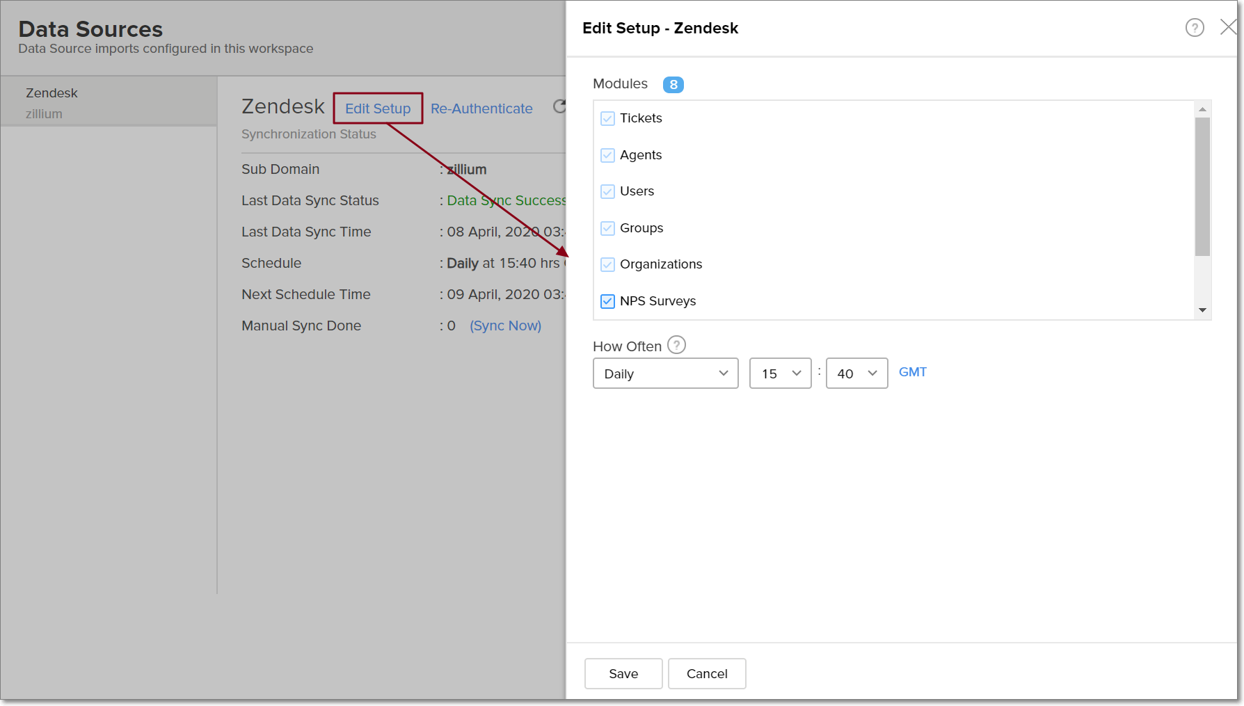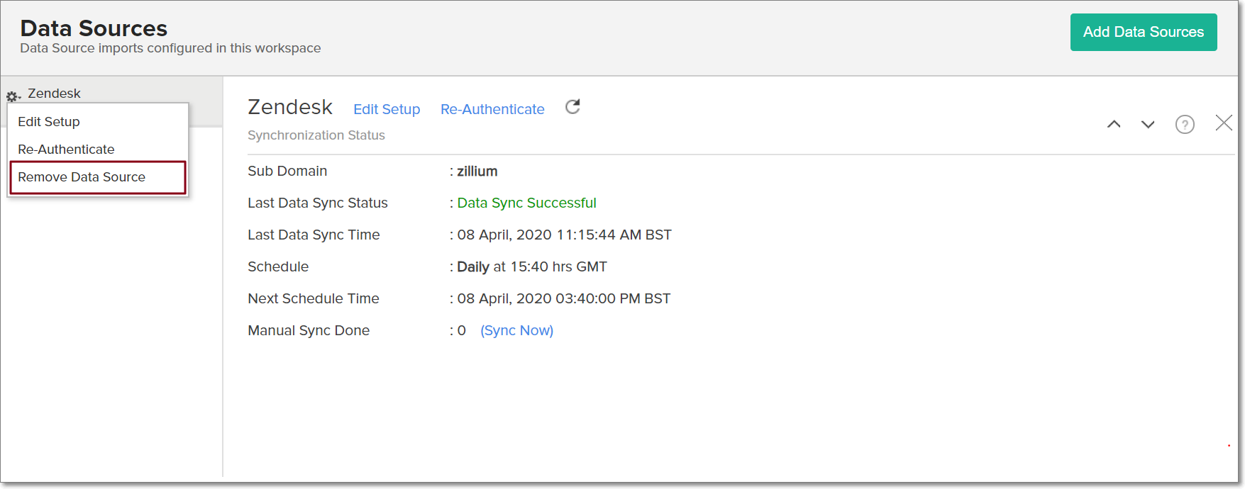 接続と同期設定を編集するには、サイドパネルから[データソース] -> [Zendesk]の順に選択します。