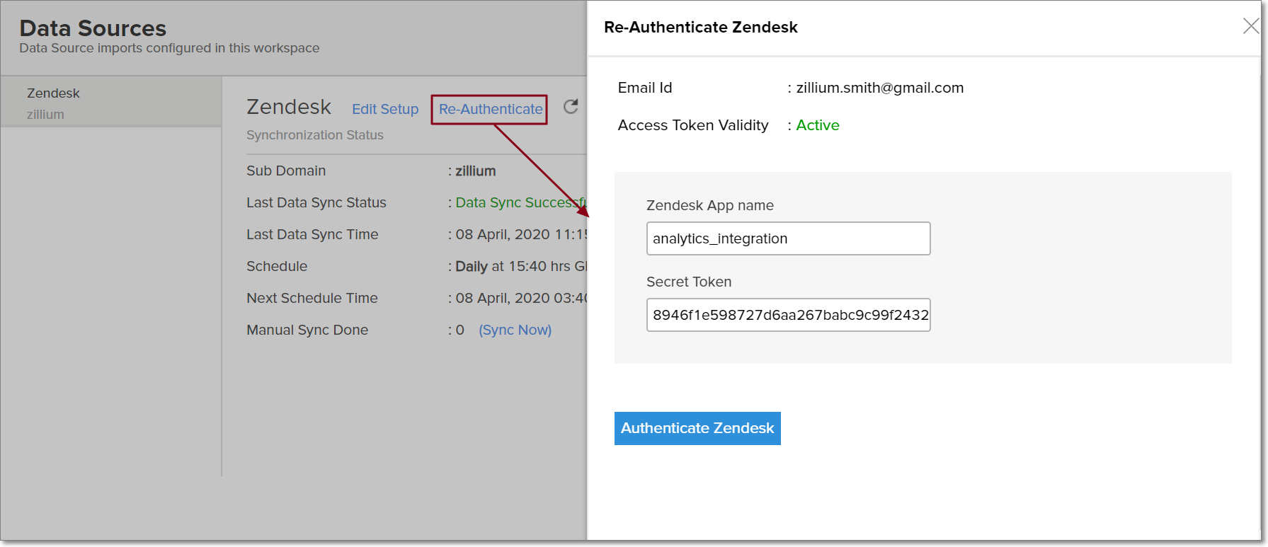 Zendeskデータのインポートまたは同期プロセスは、さまざまな理由により、失敗する場合があります。この解消には、サイドパネルの[データソース]オプションをクリックし、[再認証]リンクをクリックします。表示されるポップアップで、[Zendeskを認証]をクリックします。Zendeskアプリ名とシークレットトークンを入力して、 [Zendeskを認証]ボタンをクリックします。