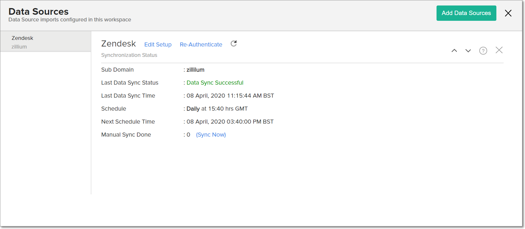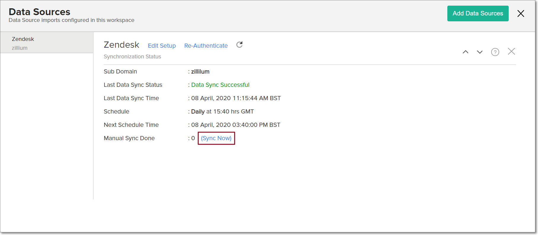 はい。このためには、サイドパネルから[データソース] -> [Zendesk]の順に選択します。表示されるデータソースページで、[今すぐ同期]をクリックします。