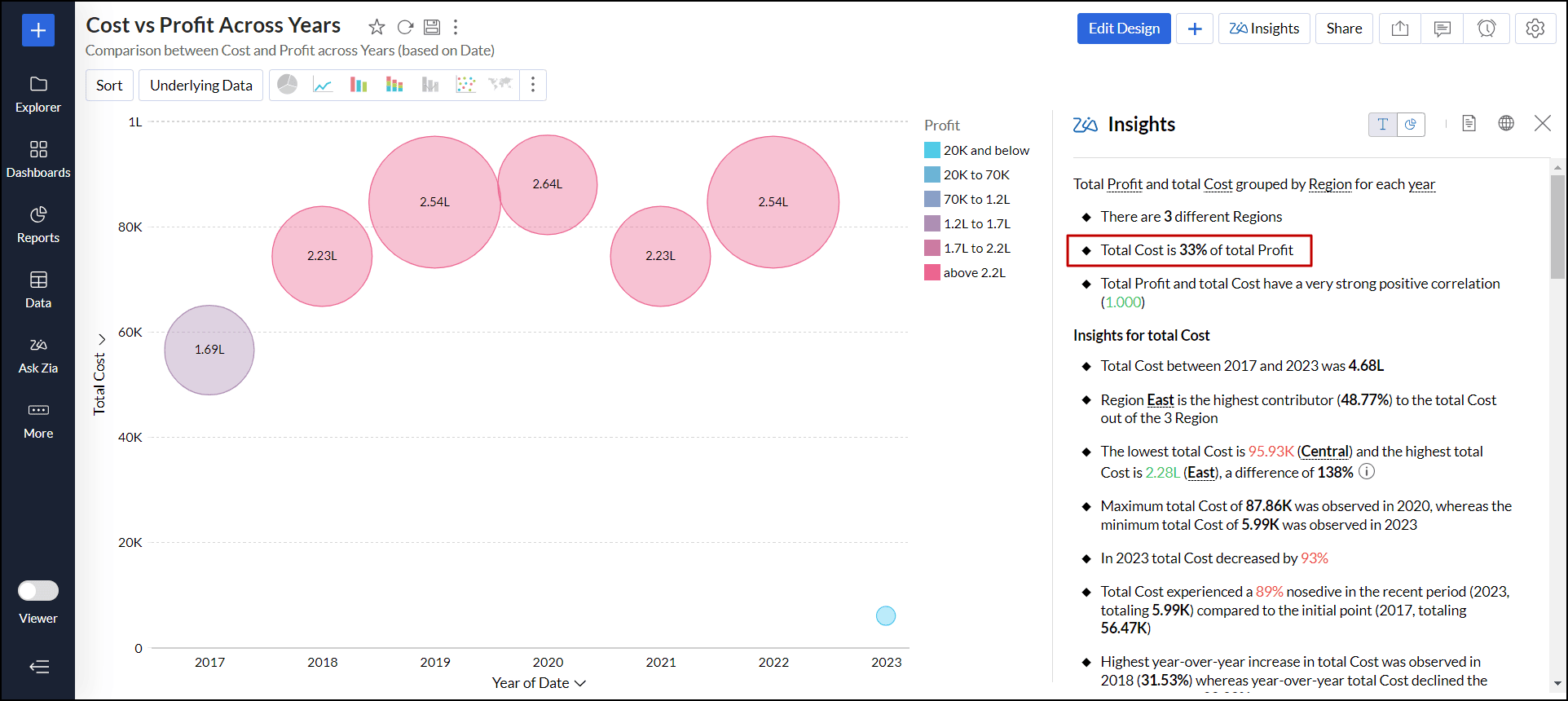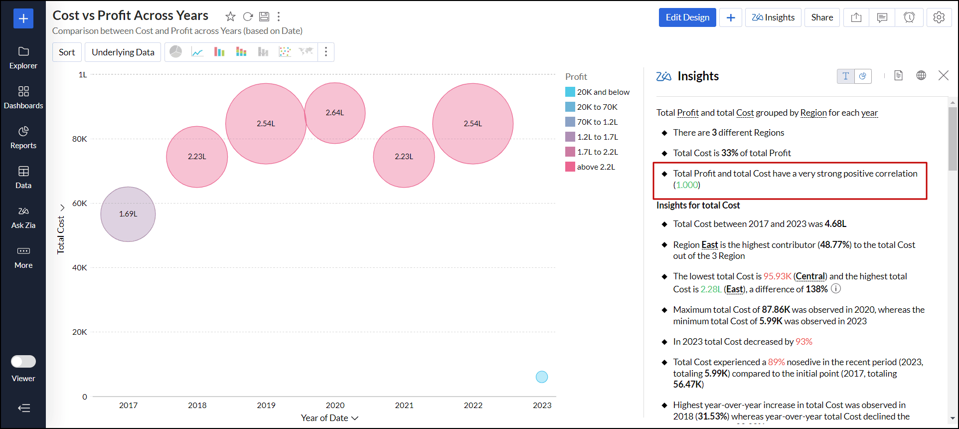 データの説明 - Zia分析では、レポート内で選択したデータポイントを他のデータポイントと比較し、データの相関、傾向、要因、異常値を把握するのに役立ちます。