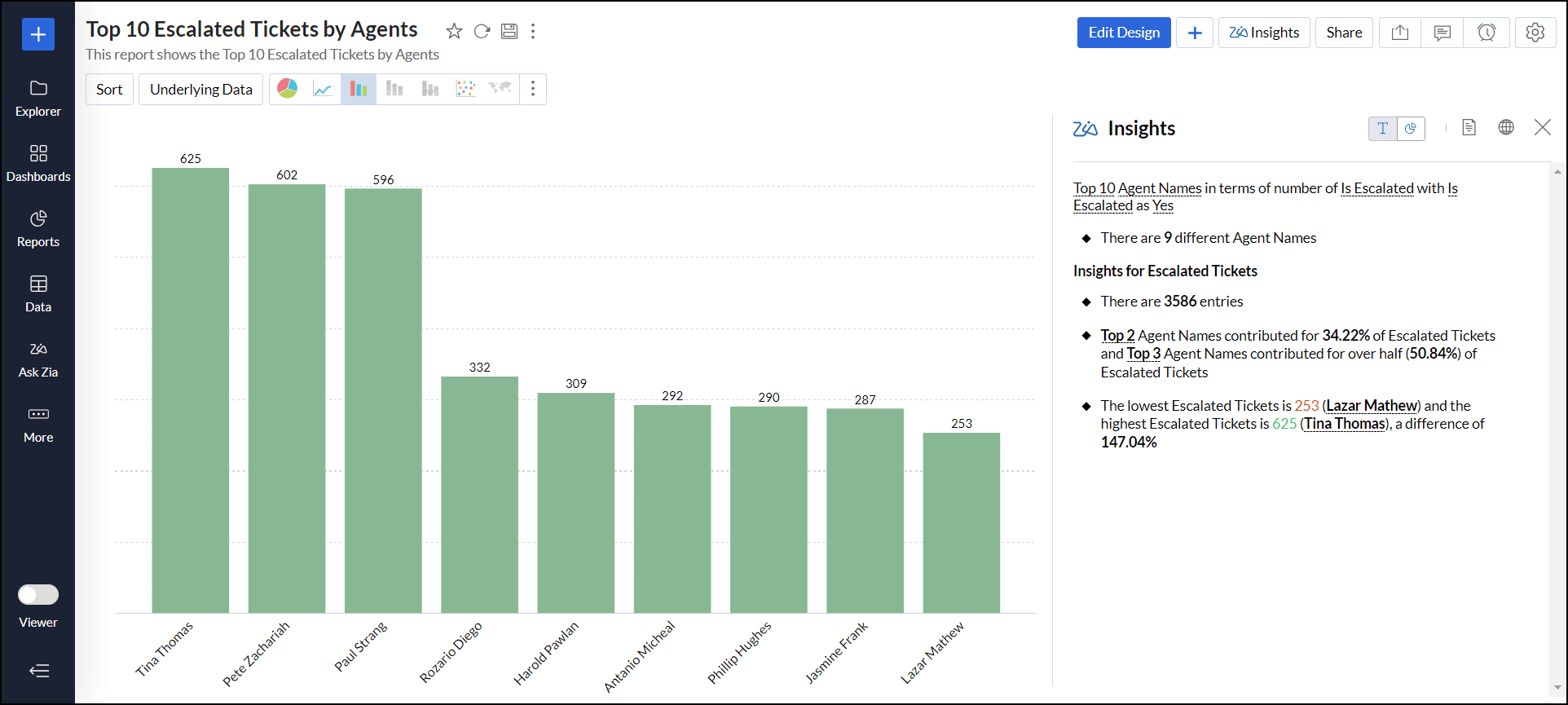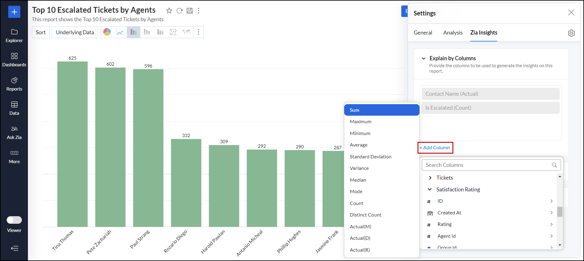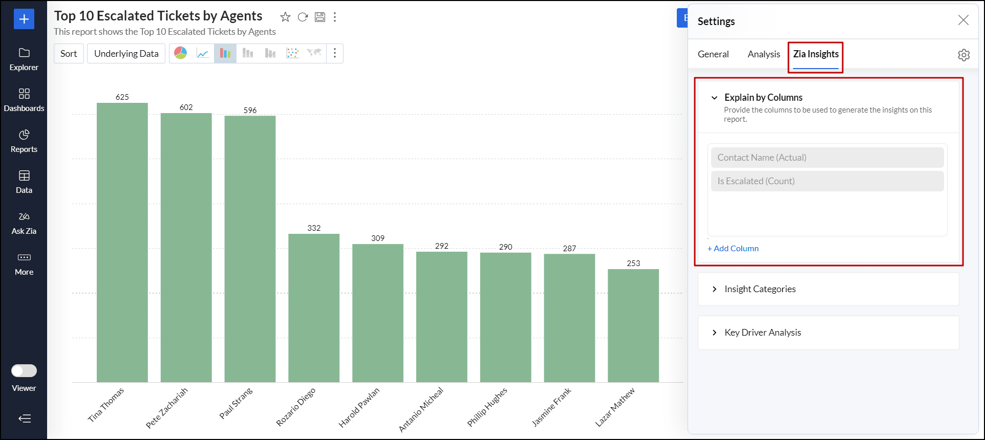 例として「エージェント別エスカレーションチケット上位10件」というレポートで、Zia分析をカスタマイズします。最初のZia分析は、連絡先名と エスカレーションされたチケット列に基づいて作成されます。
