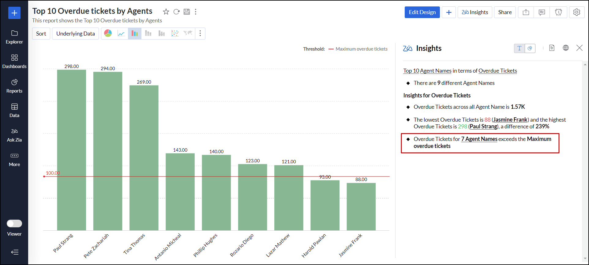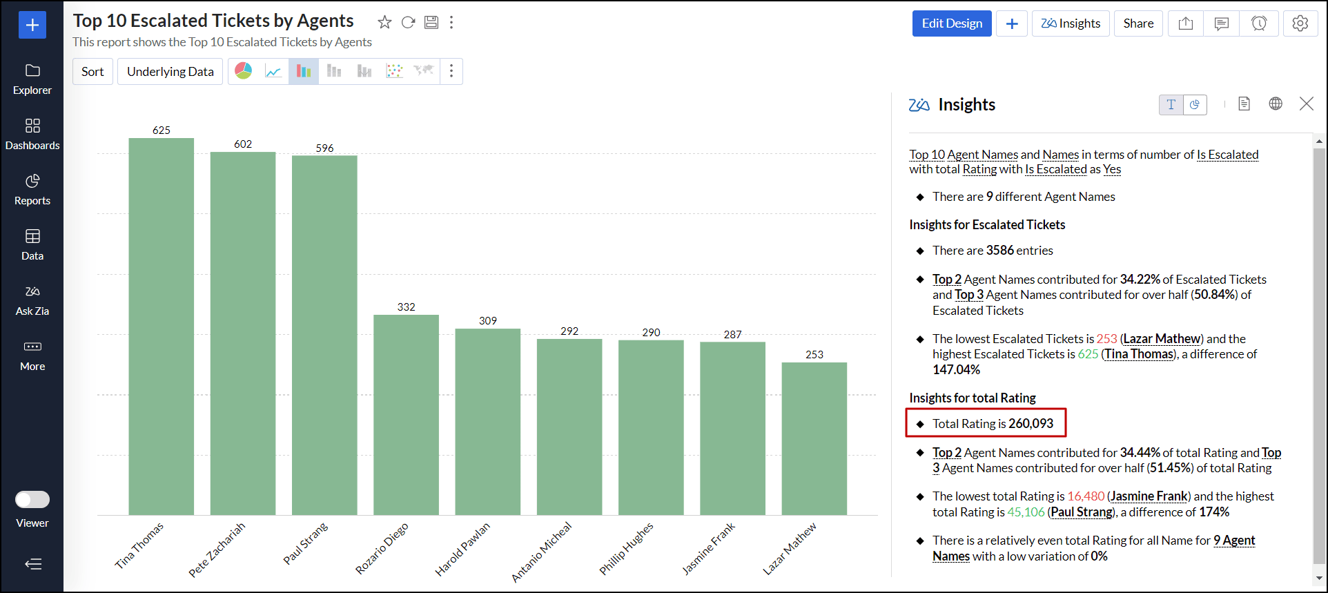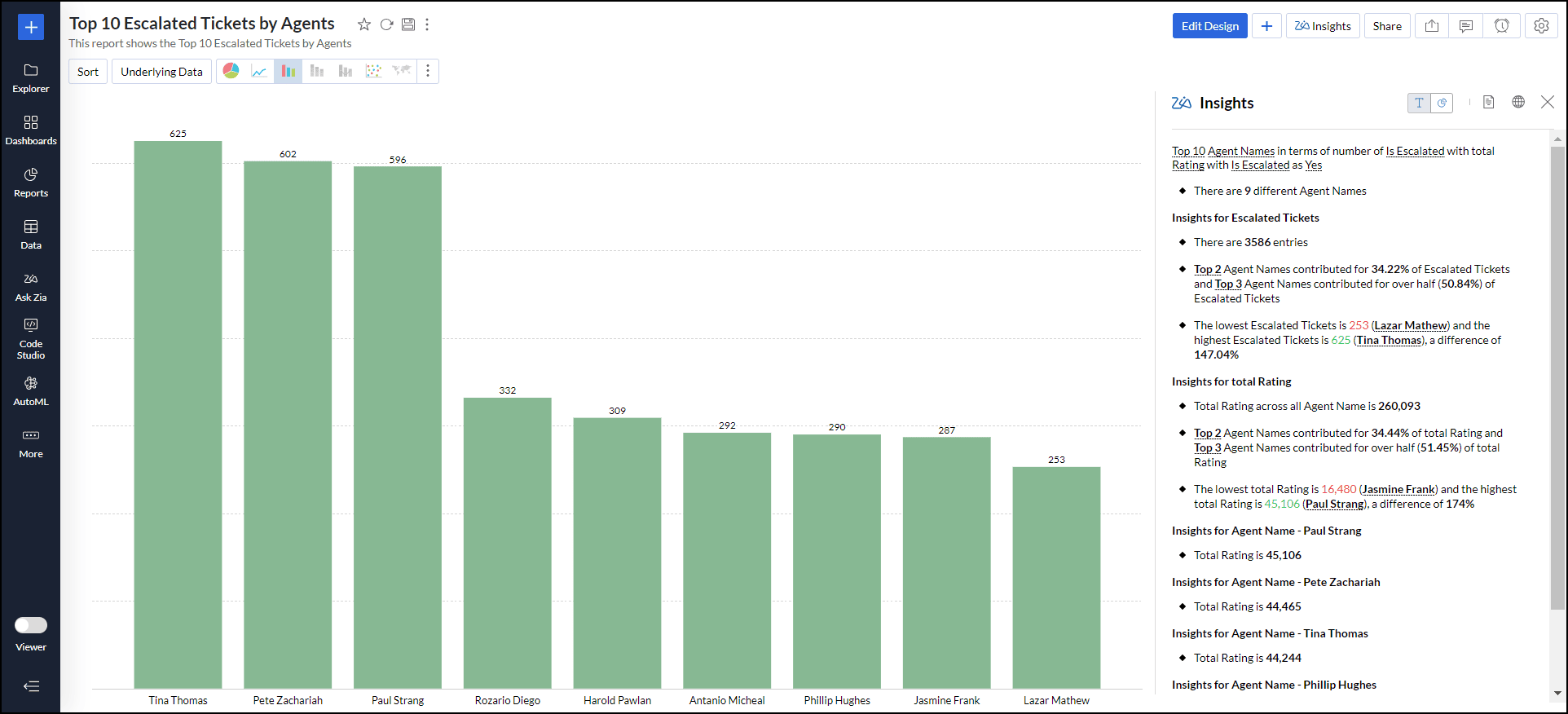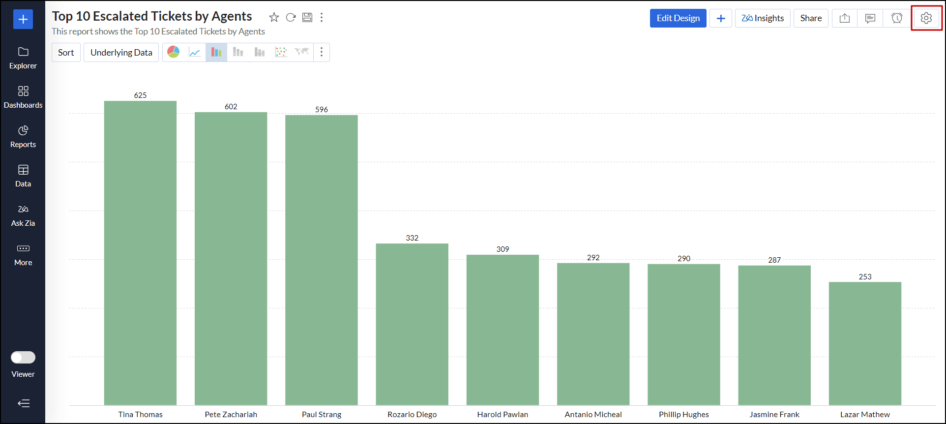 例として「エージェント別エスカレーションチケット上位10件」というレポートで、Zia分析をカスタマイズします。最初のZia分析は、連絡先名と エスカレーションされたチケット列に基づいて作成されます。