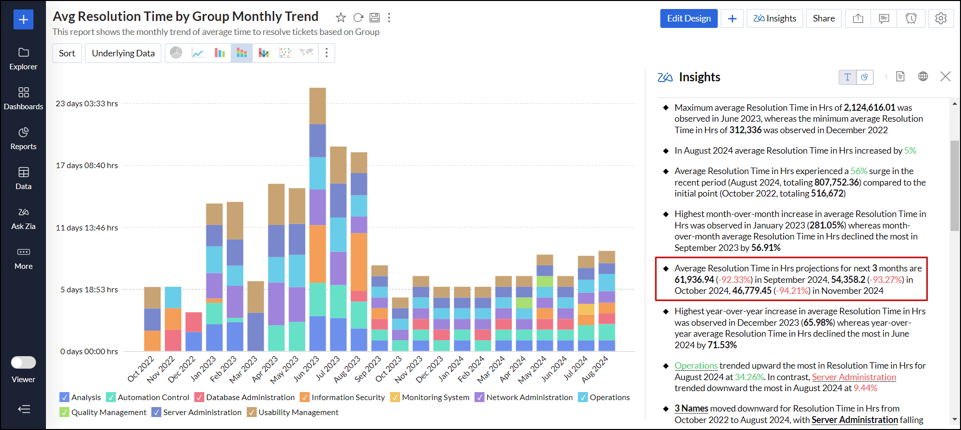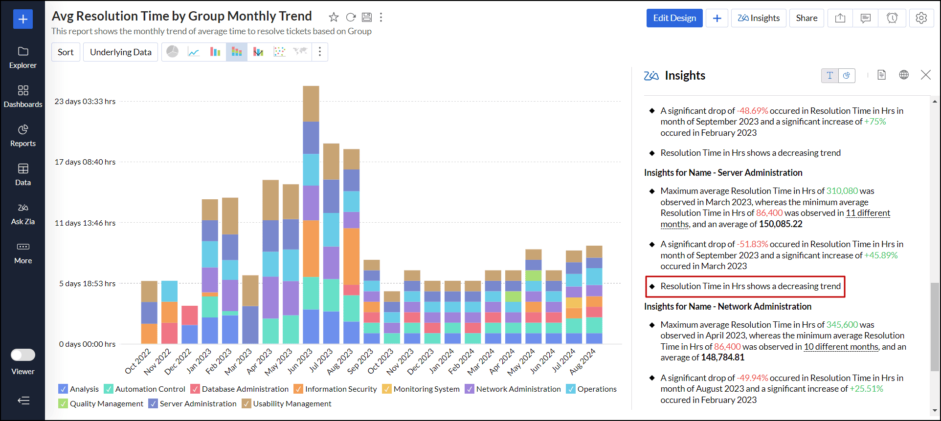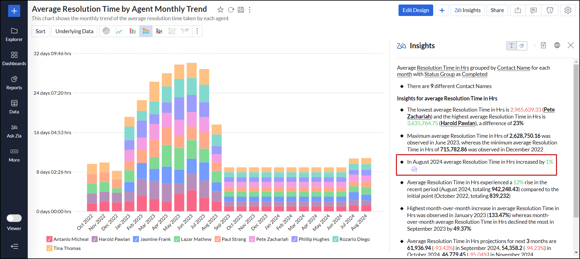 Zia分析は、凡例フィルターで選択された内容に基づいて動的に分析情報を提供し、表示されたレポート内容に沿った有益な情報を表示するのに役立ちます。