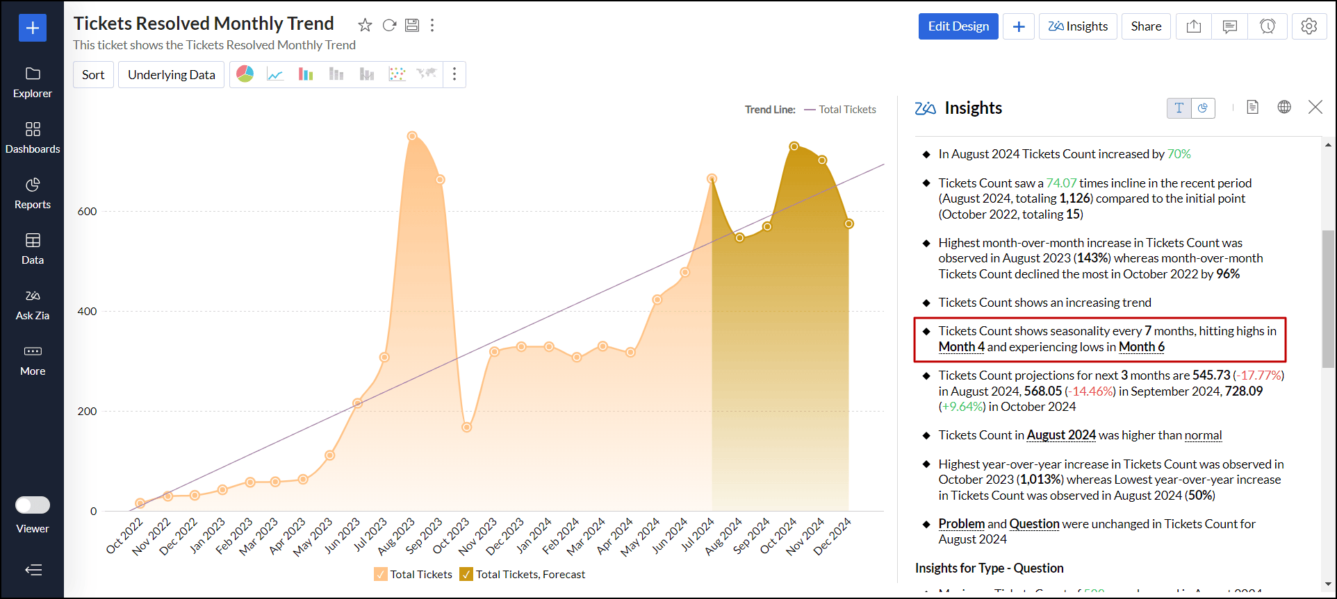 解決したチケットの月別傾向レポートでは、季節性が示されています:解決したチケットの月間傾向レポートでは、7か月ごとに周期変動が見られ、4か月目に高値、6か月目に低値を示します。