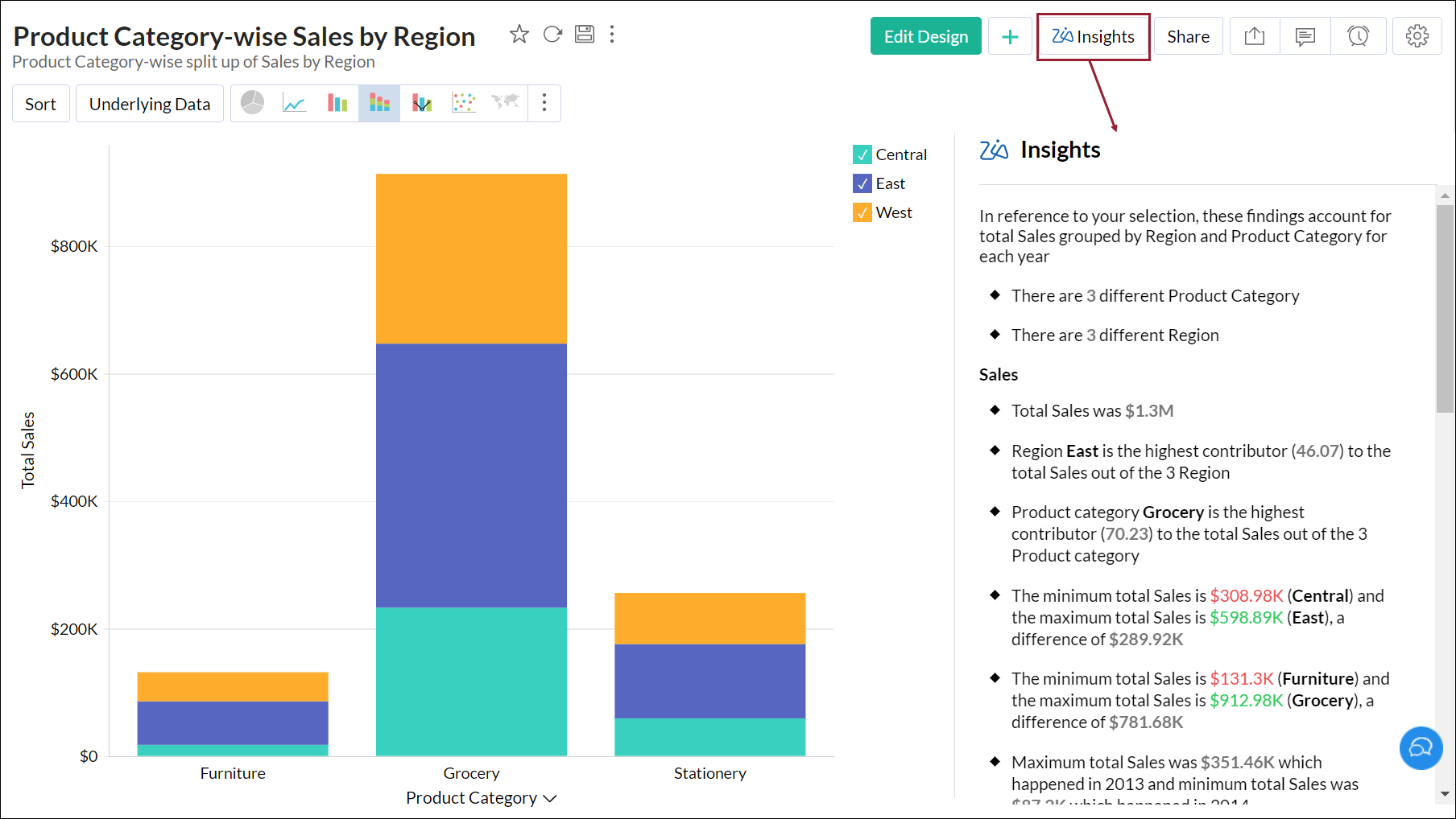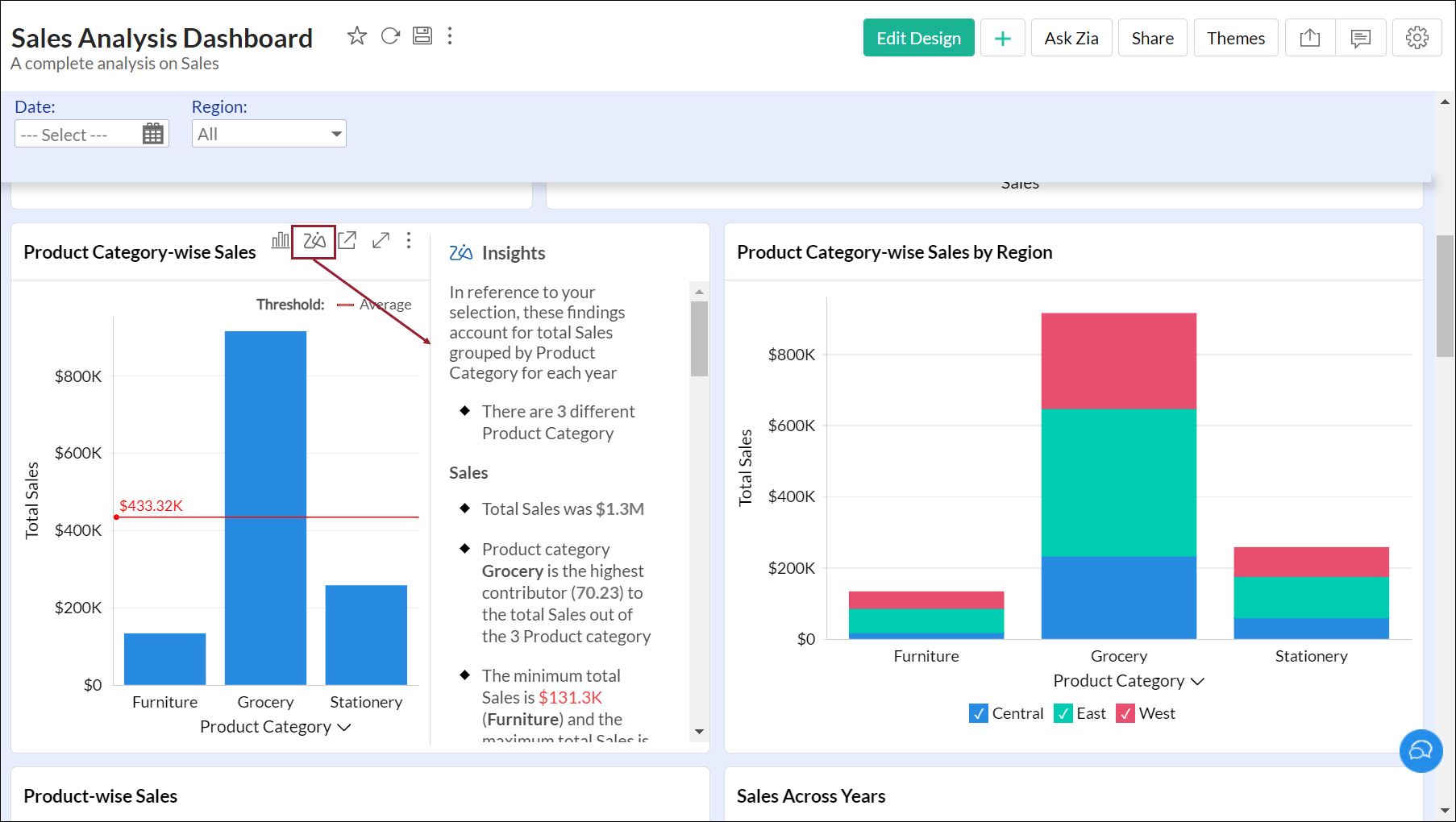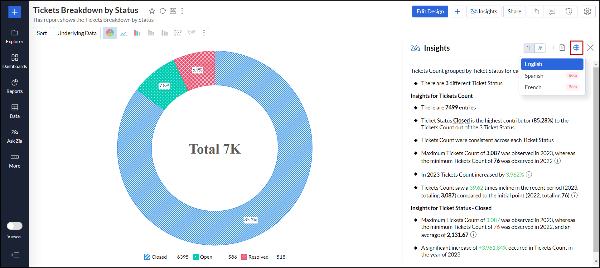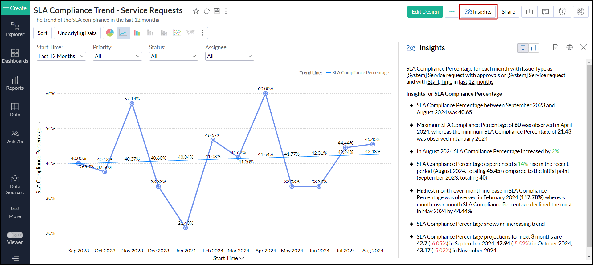 対象のレポートを開き、右上の[Zia分析]をクリックします。スライドウィンドウが表示され、分析情報が表示されます。