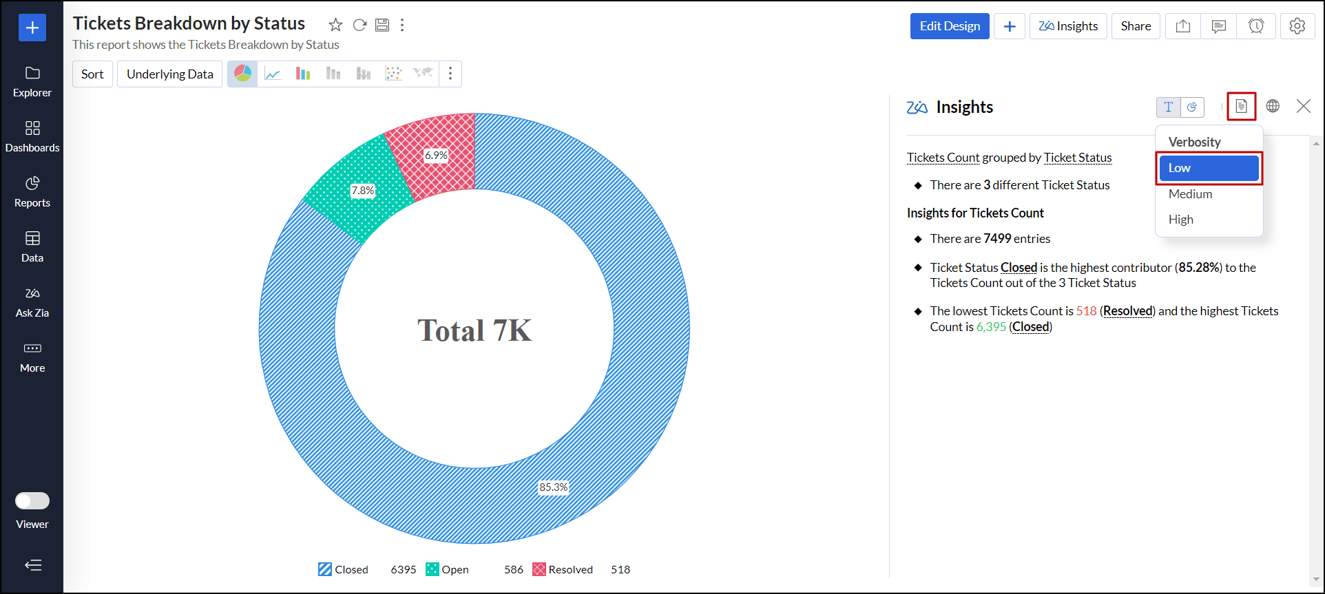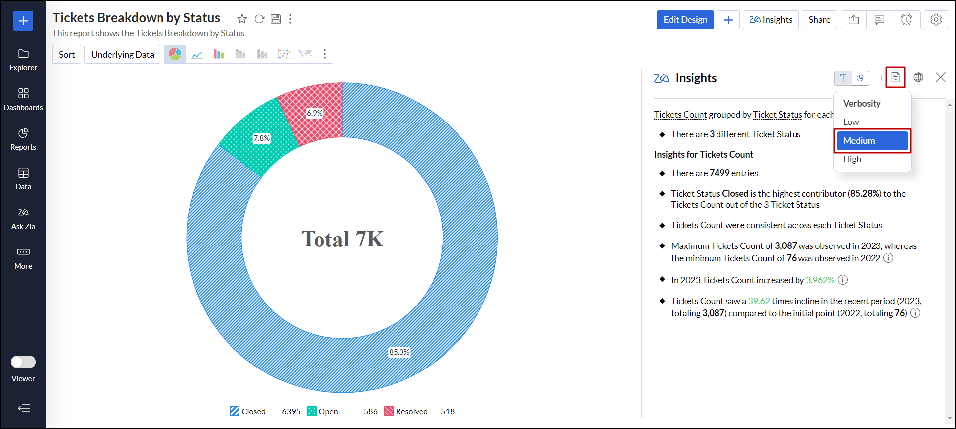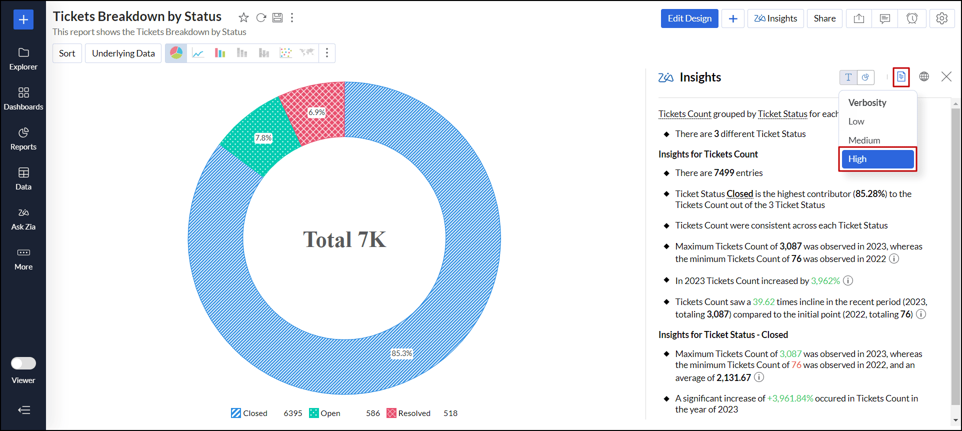 対象ダッシュボードから必要なレポート(ウィジェット)の右上のZia分析アイコンをクリックします。スライドウィンドウが表示され、選択したレポートの分析情報が表示されます。