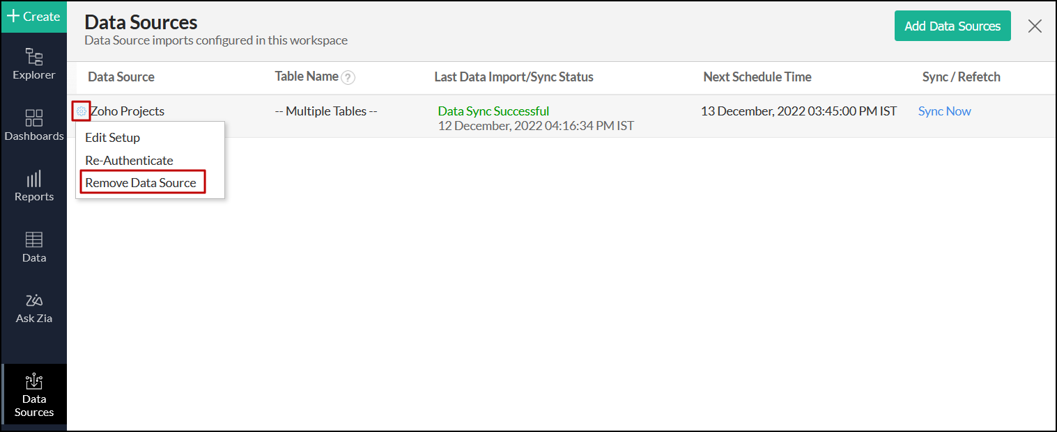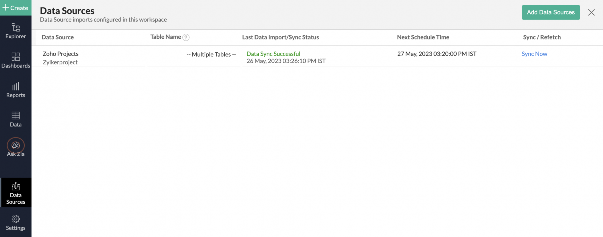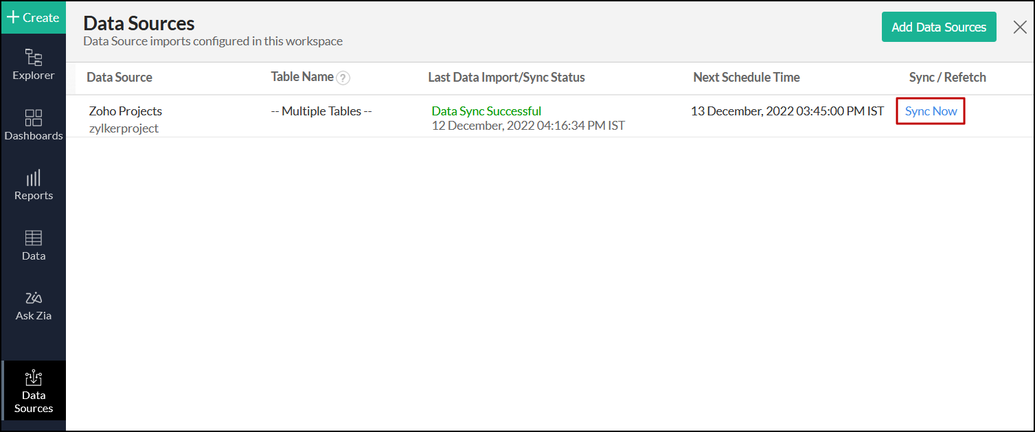 はい。これを行うには、サイドパネルの[データソース]オプションをクリックします。表示されるページで、Zoho Projectsソースに移動し、対応する[今すぐ同期]ボタンをクリックします。