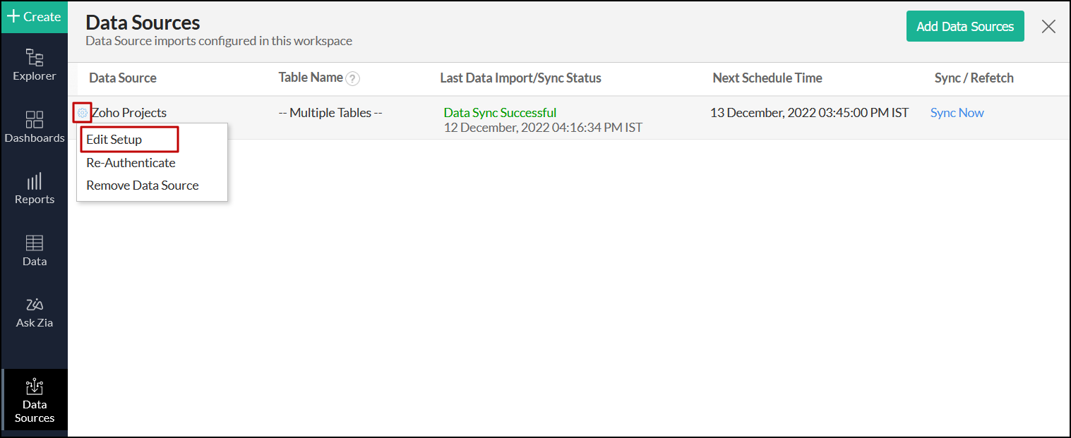 - Zoho Projectsデータソースにカーソルを当てて表示される[設定]アイコンをクリックし、 [セットアップを編集]オプションを選択します。