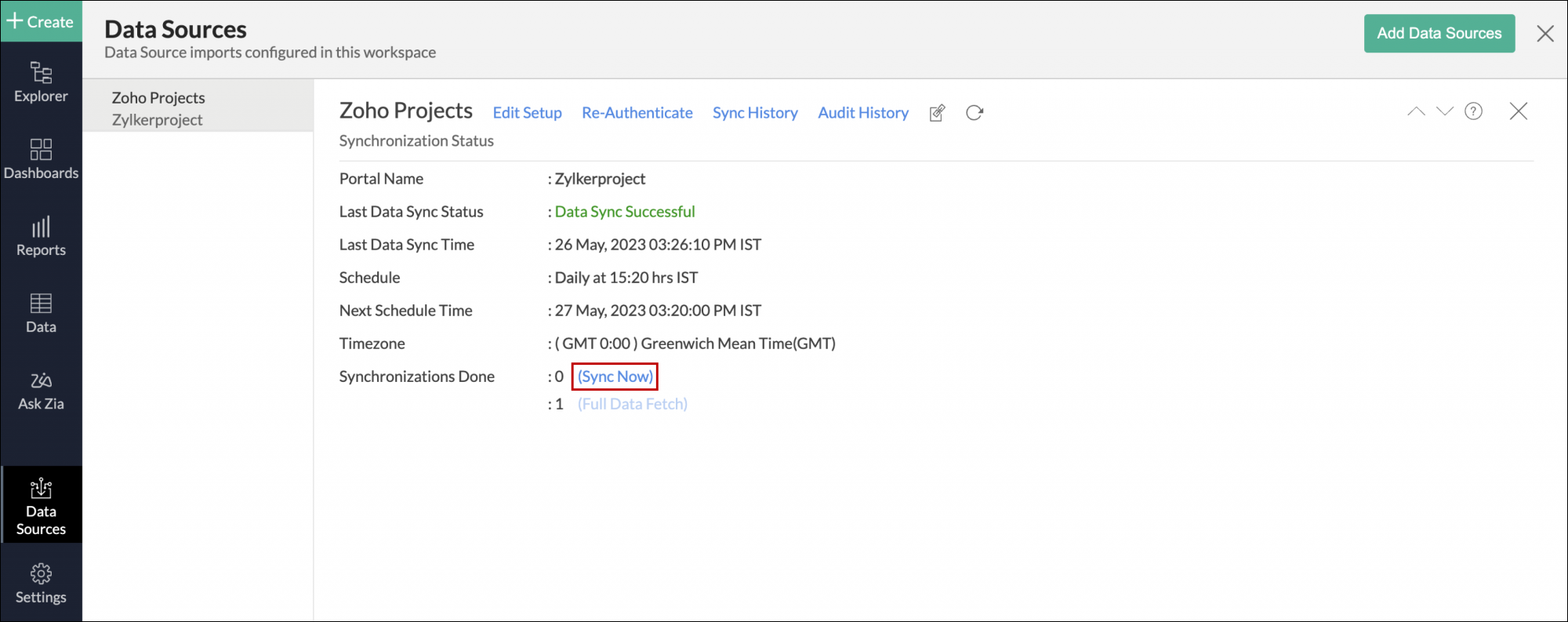 Zoho Projectsデータソースページにアクセスして[今すぐ同期]をクリックすることもできます。