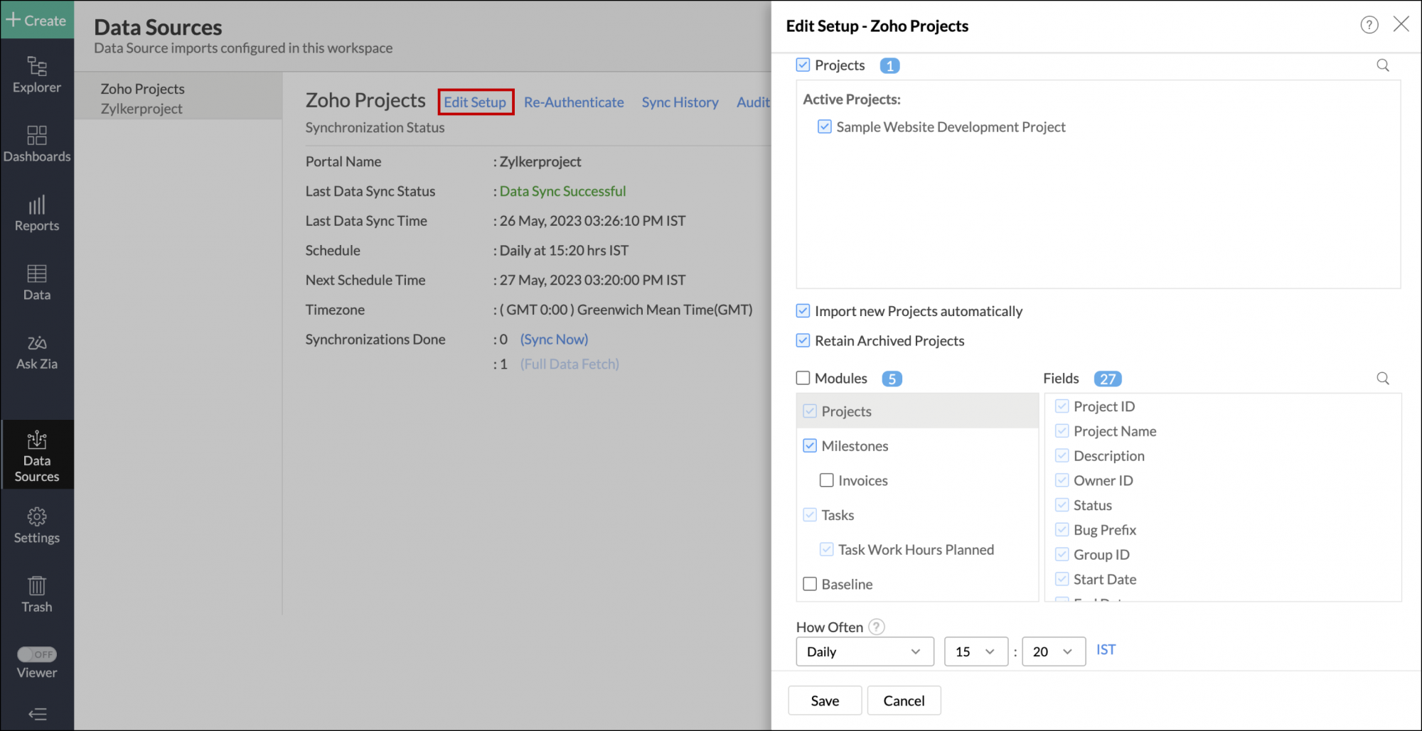 - Zoho Projectsデータソースに移動し、[セットアップを編集]リンクをクリックします。