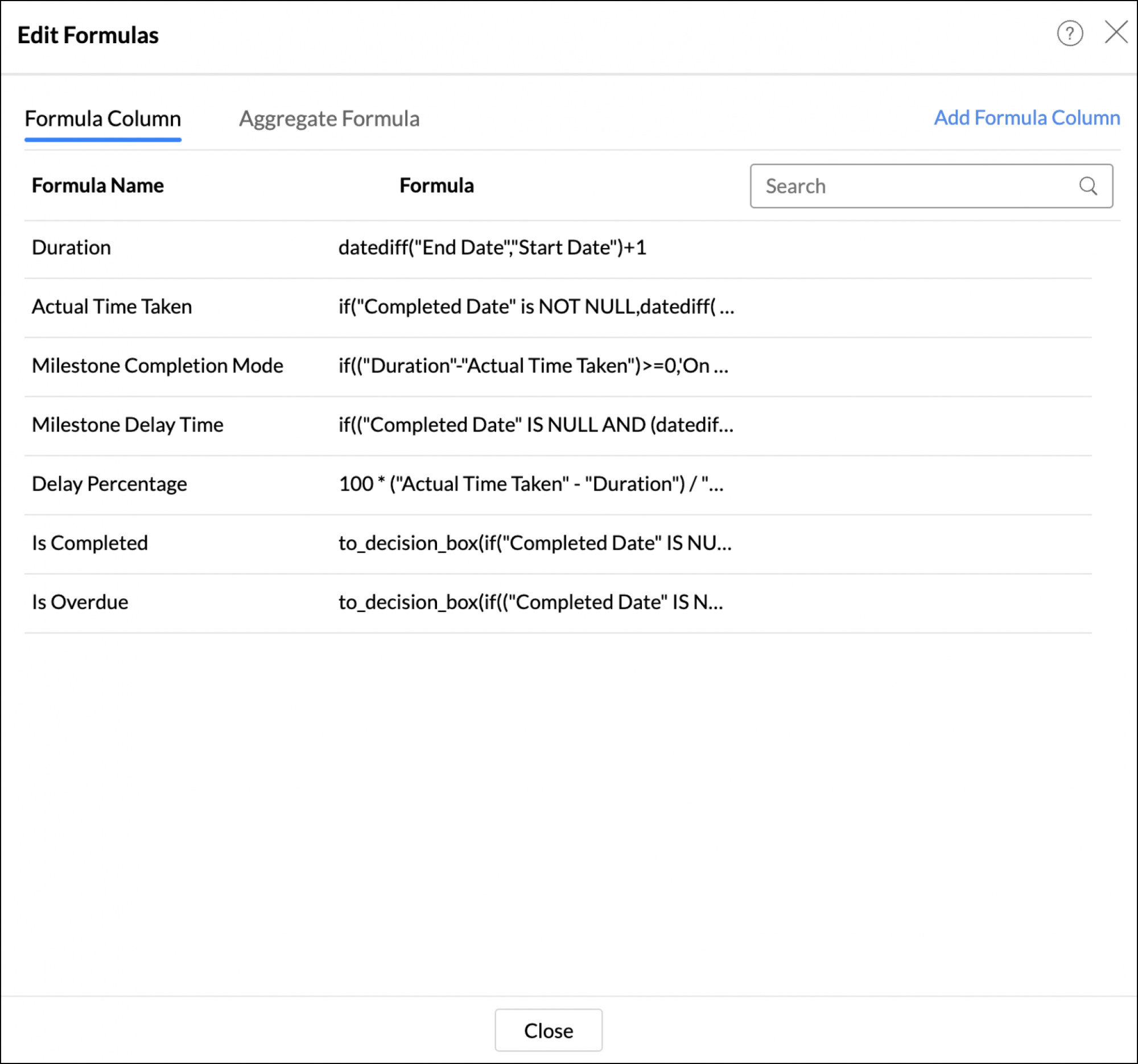 数式は、必要なレポートを作成する強力な数式エンジンを使って定義できる計算です。詳細は、このドキュメントを参照してください。Zoho Projectsモジュールに基づいて作成されたデフォルト数式もいくつかあります。デフォルト数式を表示するには、必要なテーブルを開き、[追加]をクリックして、[数式を編集]オプションを選択します。