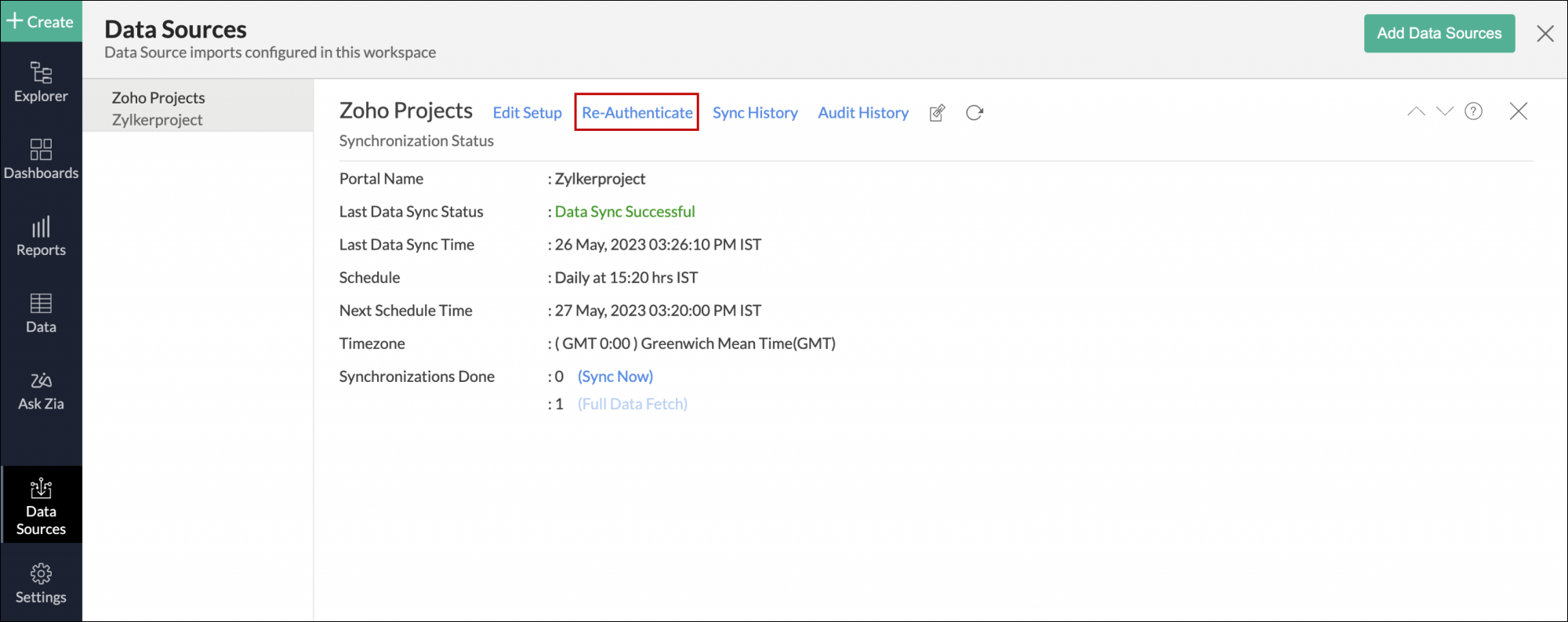 - Zoho Projectsデータソースに移動し、[再認証]リンクをクリックします。