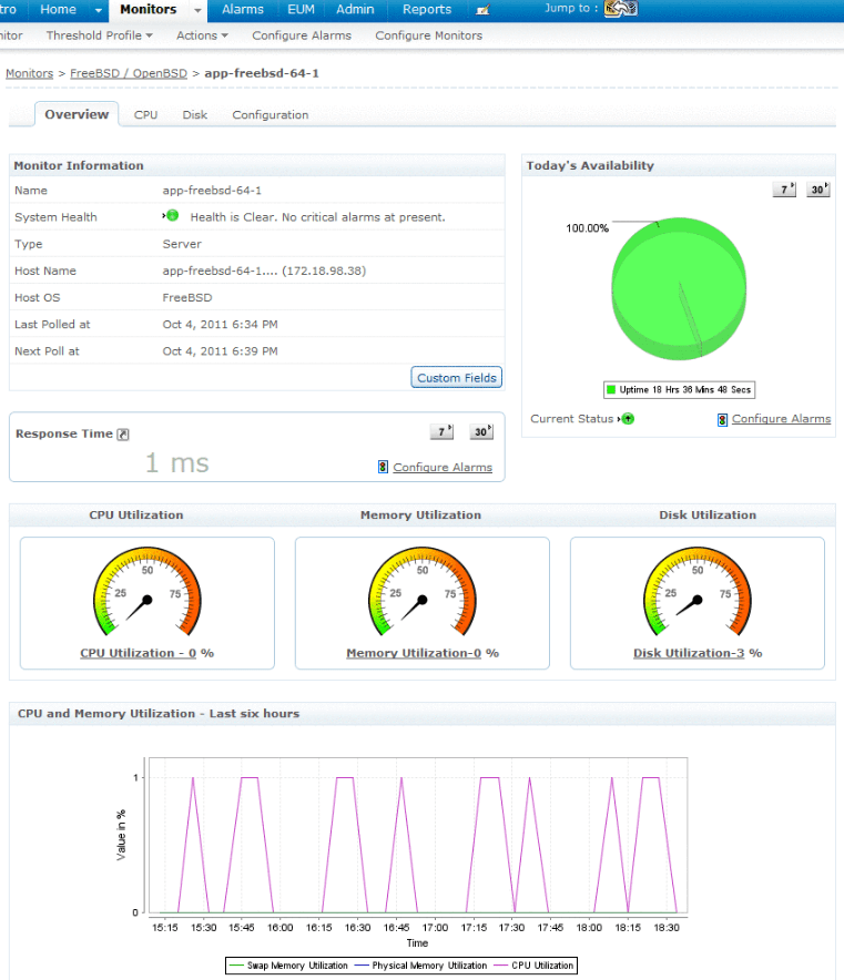 FreeBSD システムのパフォーマンス 監視には、ManageEngine アプリケーション監視ソリューションが最適です。FreeBSD マシンを検知すると、CPUメモリー、メモリー使用量などを監視します。