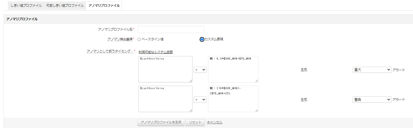 アノマリプロファイルには、ベースライン値とカスタム表現という2つの定義方法があります。