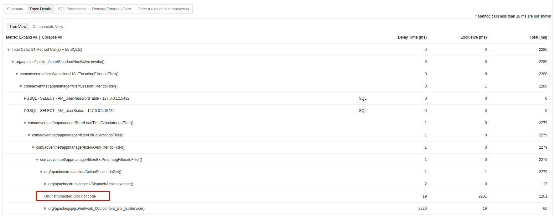 - トランザクショントレースをチェックしている際、「インストルメントされていないコードブロック」が表示された場合。