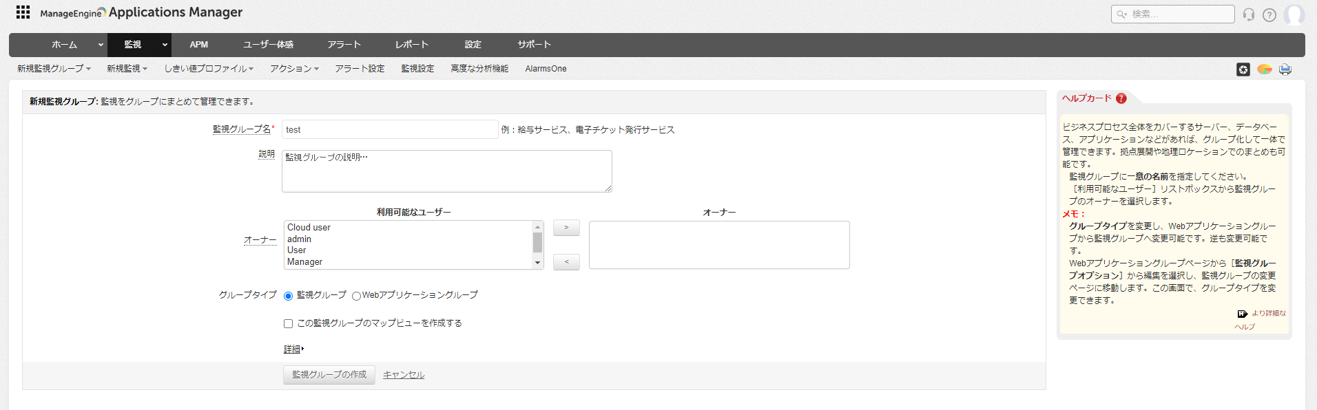- Applications Managerにログインし、サブメニュー[新規監視グループ]→[監視グループ]をクリック