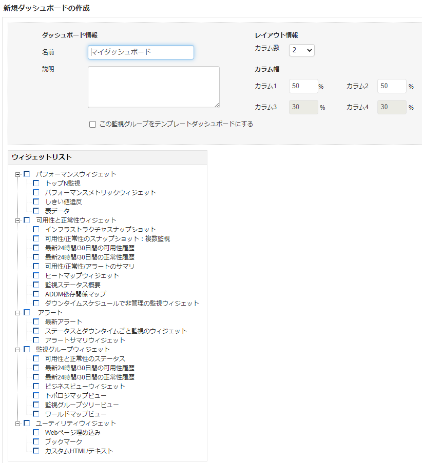 テンプレート化することで、特定の監視グループに適用したり、すべての監視グループに適用することも可能です。 - ウィジェット一覧から追加するウィジェットを選択